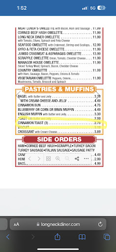 Read moreWhen we come into the dinner for breakfast, lunch or dinner we usually get what we order and it’s good. When they make a mistake in dinner it is corrected. Take out is never successful. I specifically order the Healthy Corner Stir Fry Veggies with Shrimp and it is healthy and tastes great. Last time I did take out I ordered healthy stir fry vegetables with shrimp and received fruit and cottage cheese. Tonight again I ordered the healthy corner stir fried vegetables and shrimp and I received 2 giant servings of Cold potato salad and Coleslaw on a bed of Raw Sliced purple onion with a sliced boiled egg and Fried Shrimp on top of all of all of that. The excessive amount of raw purple onions ruined the taste of what I did receive. Although I will not stop dining in I will never do take out again. There is a huge disconnect between the person who answers the phone to take the order and the kitchen. Yep my husband picked it up and didn’t check it again but he did work all day and was exhausted. Bottom line even if you emphasize what you are ordering for take out it is a crap shoot of what you will receive. By the way Long Neck Dinner 2 pounds of cold potato salad is not healthy and nobody eats 2 pounds of coleslaw for dinner, it is only good in tiny portions. The Shrimp would have probably been good if not for the raw purple onion they were on. Check the order taken 10/28/24 my husband order breakfast scrapple, pancakes etc and I ordered The Healthy Corner Stir Fried Vegetables with Shrimp if you care to improve in your...