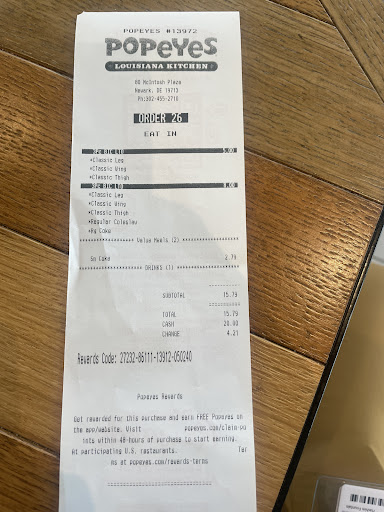Read moreI went to Popeyes the one located near Christiana Skating Rink via the drive thru and let me tell you how awful the chicken was. I am not sure what's going on there, maybe lack of management but my chicken was old, refried and tasted as if the oil was never changed. I experienced this twice already. Why I went there another time around? Well, because I thought it was a one time thing. They was never like this and it's a shame because that location only been in business for a few years. I never drove back for a refund or to complain about it as I had a a long day. But I am sharing my thoughts on this review. Go to Popeyes located in Bear. Your better off...