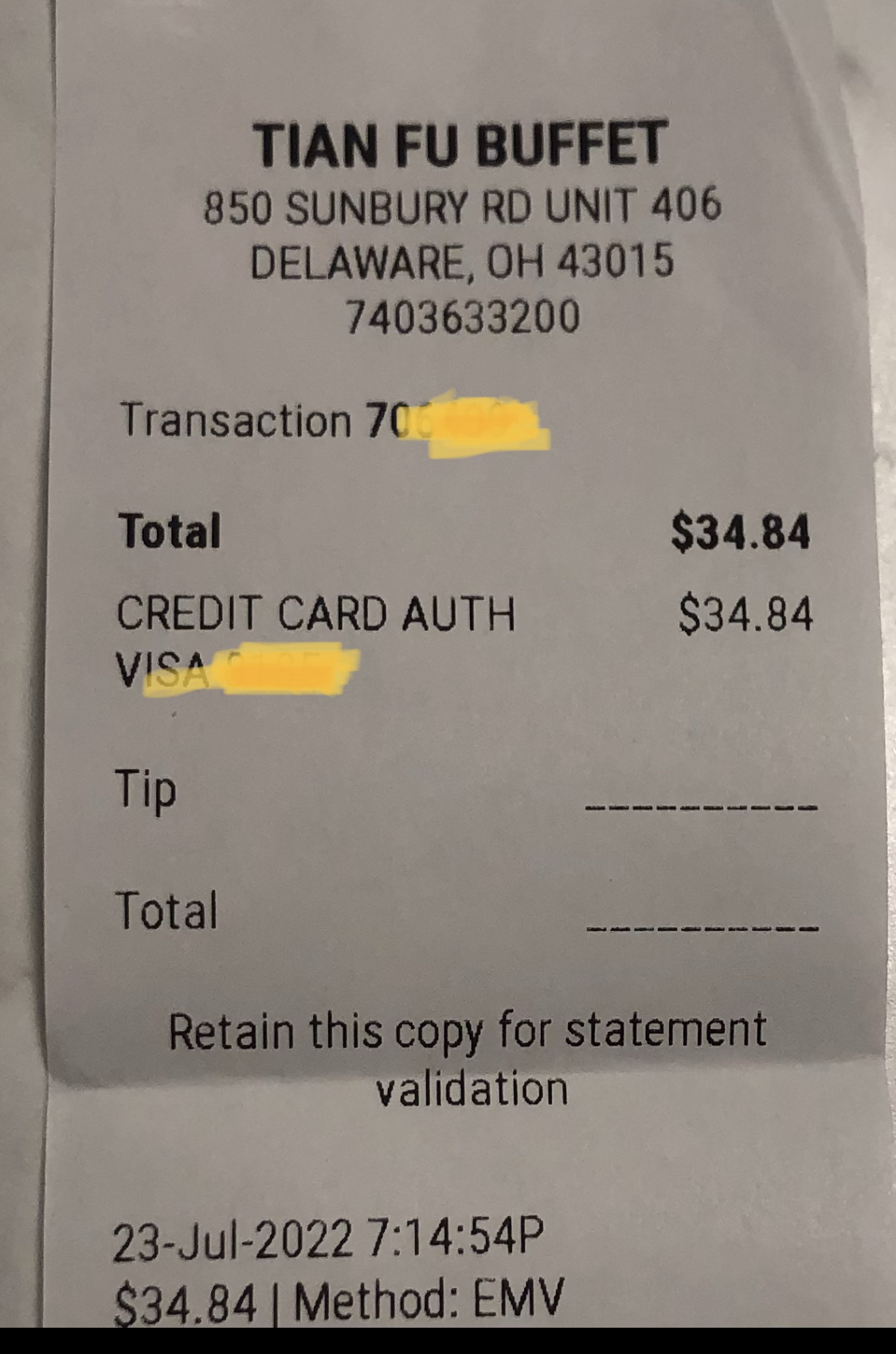 The restaurant was clean. All the food bins were full and there was a good size selection. When a worker brought me the check she stood there waiting on me to pay. But instead of leaving the receipt and walking away for it to be signed, she stood there and waited on me to sign it and fill out a tip. I typically would not have tipped as I received no service. It's a self service buffet. But I felt obligated too as she was standing there wanting me to fill it out. So I gave her a dollar and went on about my business.