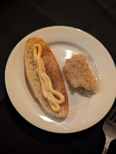 We were treated with a free appetizer of flounder along with a slice of bread with a cheese spread on top. This, the fresh bread, the salad, and the main course....you will be stuffed! They did have a banana desert which is also made tableside, but we had no room. We did see it being made though and it looked delicious!