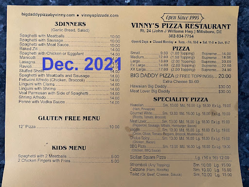 Read moreI work at Preston Hyundai in millsboro and the owner margarita came into today for some service on her vehicle . She explained she owns Vinny’s here in town and things have changed . Few hours later after she left a pizza arrived here at work . She sent us a sample pizza for our guys to try . First off that was very nice of her to do such a thing and secondly the pizza WAS AMAZING . Just a standard thick square pizza and it was seriously delicious . Anyone near millsboro or surrounding area MUST try this pizza . Place has new ownership and everything is new . Margarita thank you for the pizza and good luck with...