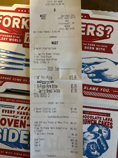 Read moreI placed an order online like I do all of the time and when it arrived the thin crust pizza had so much cheese on it the pizza was soggy and greasy (if you know the thin crust it’s usually crispy) I also ordered GARLIC bread twist but received cinnamon twist (didnt even have the decency to give me icing with them) I tried contact the store about 8 times and it just rings over and over until it hangs up because it detects my number and it seems they are avoiding. I then blocked my number to call back just to be hung up on by the answering service because I didn’t have a special ?? I blocked my number a 2nd time to be told they were going to connect me to the store just to hear it ring over and over. I tried to report the issue online and was met with 2 solutions 20% off my next order (which is a daily coupon online anyways) or 60 points which can be used for a free item. When I really just want my bread twist replaced rather than take an online solution to be forced to spend more money with this place that is very...