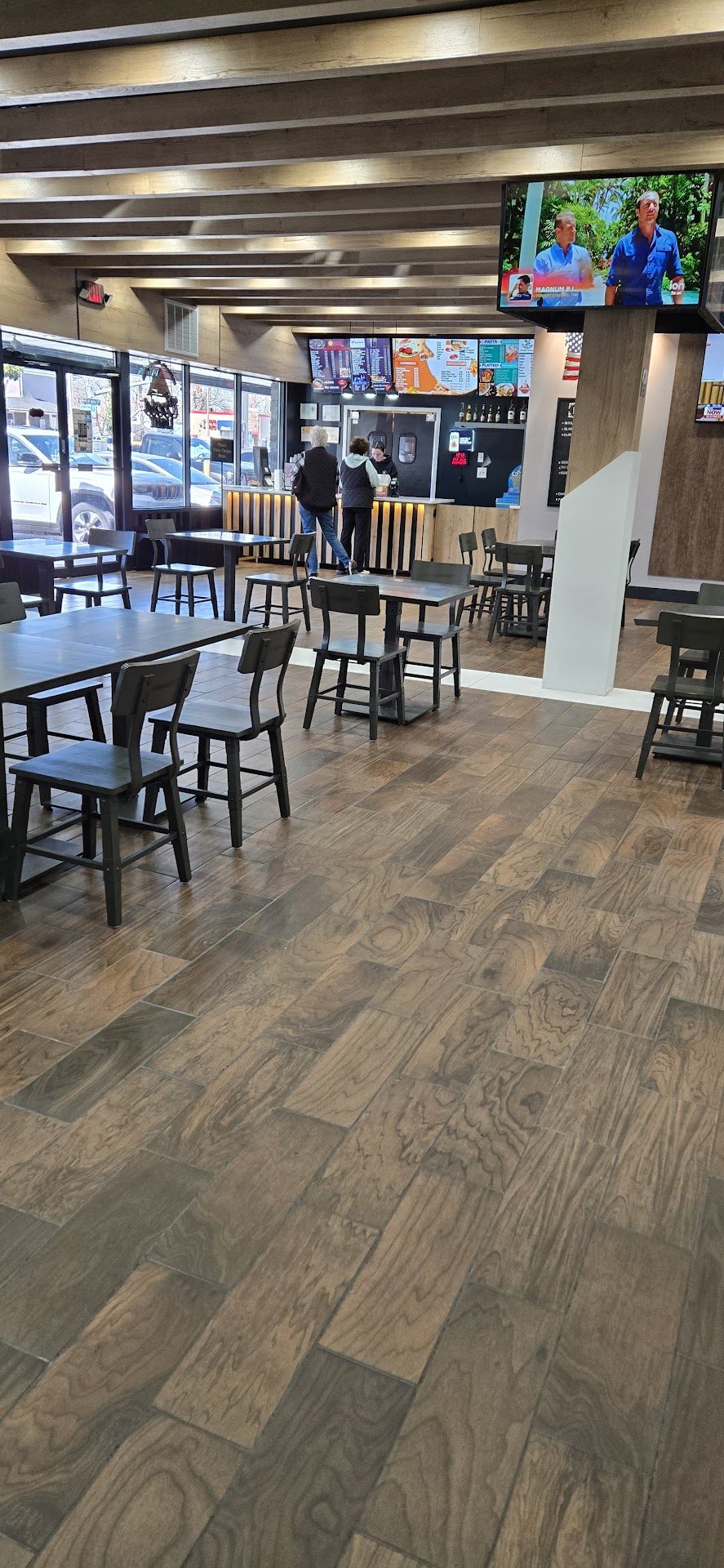 We chose to pick-up. The store was a little cold inside, but no matter. They are pickup and delivery only. The store was adequately staffed with (3) guys in the kitchen, (4) ladies behind the counter and another guy sitting down I suspect waiting to make deliveries. Our promise time was 5:55pm and we were called to the counter at 5:57pm. We got (1) large square pizza and (30) wings for $36.02.