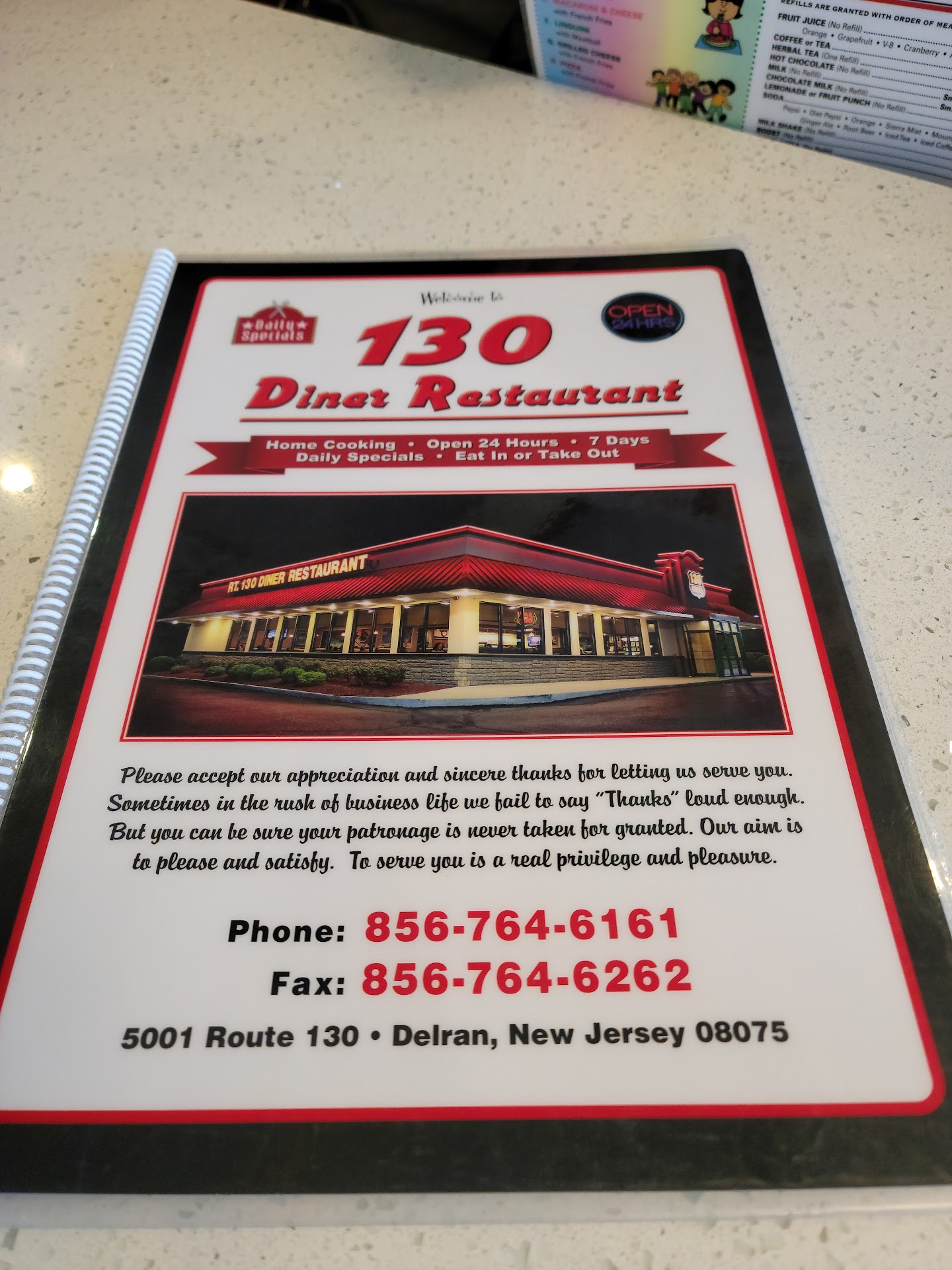 Read moreEverything you would expect from a diner in New Jersey. Almost every table filled with all types of groups of people. You had families enjoying a NJ diner breakfast. You had our elders enjoying their cups of coffee relishing in the happiness of of the younger generation doing what they had been doing for a lifetime at a NJ diner. You had your younger crowd up all night from the part they had just left enjoying that hangover cure known as a NJ diner breakfast. With every different group of people. With every different person wether the customer dining or the staff waiting, cooking, cleaning, curing, providing the enjoyment to each and every customer. Memories are made. Not just any memory. These memories lead to bonds that strengthen generation after generation of people. That is the power of a breakfast from a NJ DINER. Rt. 130 diner is not alone in its ranking of diners. Each and ever diner has its own qualities that cannot be compared to another diner. With that being said, their are standards that makes a diner a NJ Diner and not just a diner located in NJ. Rt. 130 Diner meets all requirements. I,Mike Spazz, do by grant, by the power given to me by myself, on the basis of me being me and I wanted to do it. I do by award the SPAZZ'S Recognition of Rt. 130 Diner. As being an...