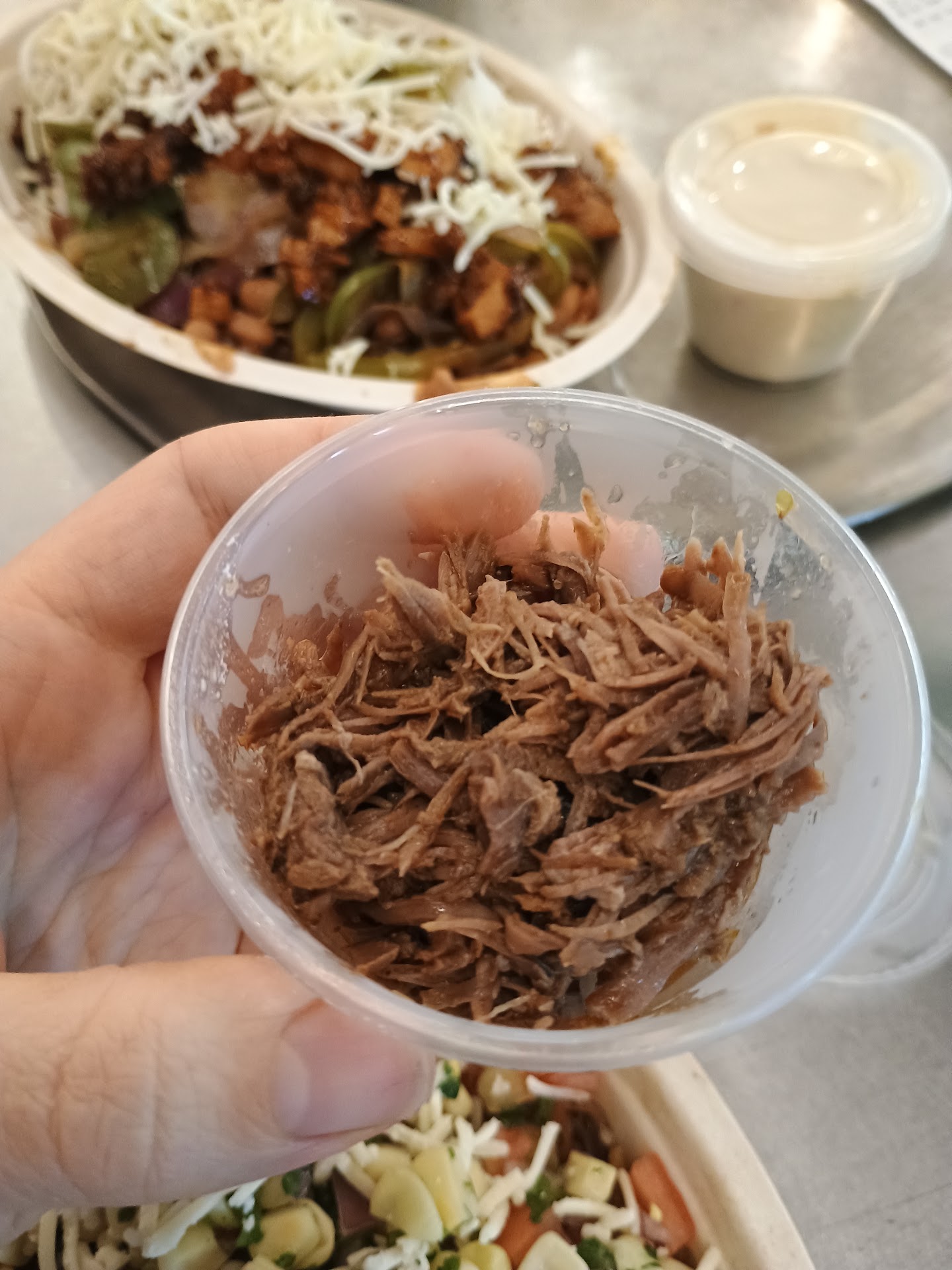 The employee used a pair of tongs to place a small amount of pork in my bowl. He then added an even smaller amount—no bigger than a mouse's bite. It was almost comical to see how convinced he was that I was getting an adequate amount of protein. He didn’t use any measuring device, just relied on his keen eye and loyalty to Chipotle.