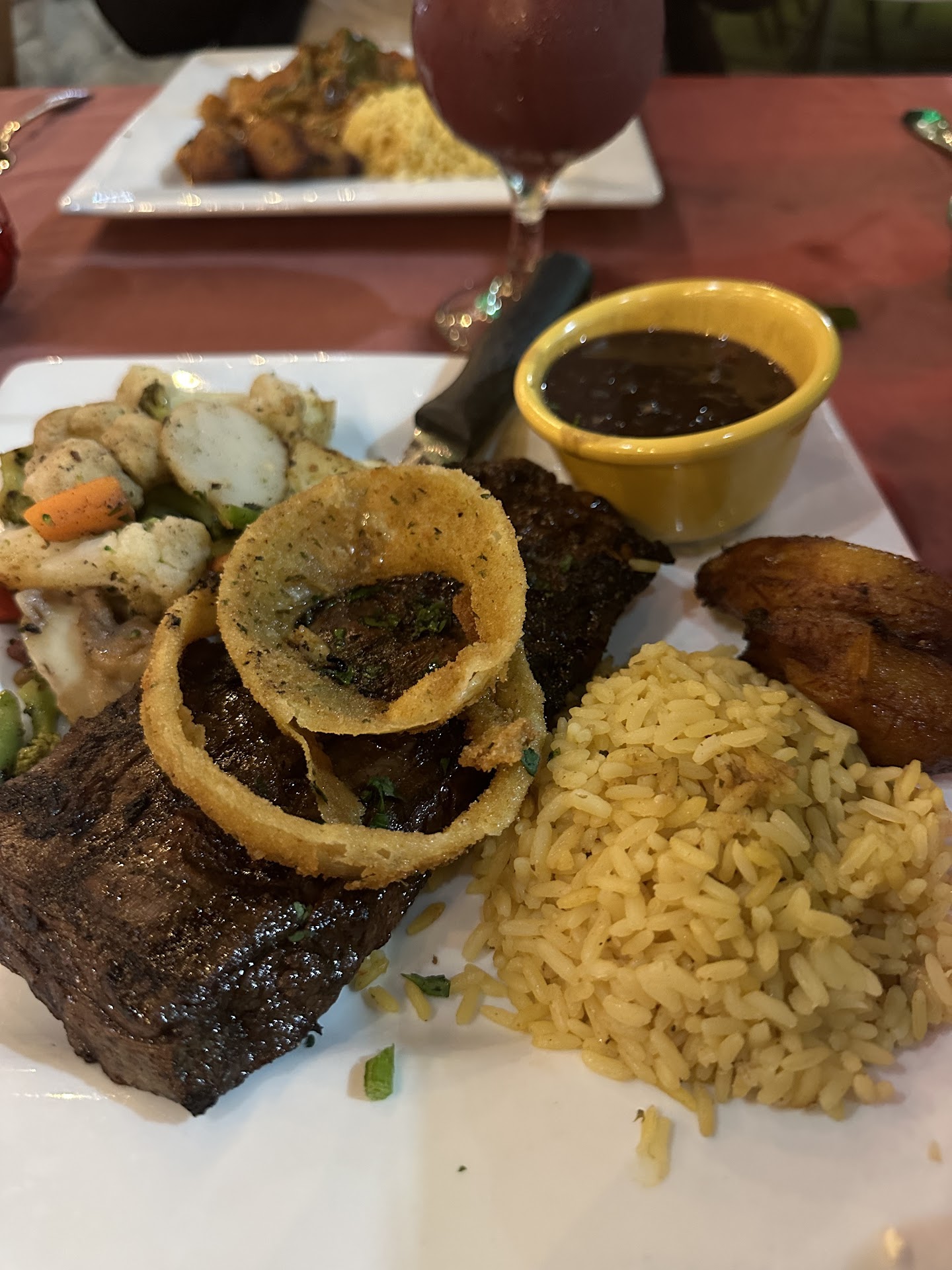 Read moreWe went here based on a friends referral with high expectations warm atmosphere, quaint decor.. We started with Sangria which was very good. Warm bread, salad, again very good. We were excited. Ordered the yucca croquettes, lacked depth of flavor, insipid. Calamari was frozen, over cooked, and tasted like old oil. We sent it back. Had lobster bisque which had a nice flavor, but no lobster, and some kind of mushy white fish in it. New England clam chowder was good, and conch chowder was also good. We really wanted to like this place. The reviews looked so good. I don't know if it was just a off night, or if this is how the food always is. I am just giving my review based on tonight's meal. Now onto the main dishes. We went with the recommendations, skirt steak, paella, and macadamia nut crusted grouper. The skirt steak was cooked properly, but had no taste. It lacked flavor, lacked spices. The rice was overcooked and seemed day old . The dish had too many things going on, on the plate. The appearance was not appealing to look at, the cauliflower, broccoli side was mushy and over cooked again lacking flavor. The paella was over cooked and in no way represented a true paella. The rice was overcooked mushy, the seafood was frozen, lacked flavor and was gummy. The grouper did not taste fresh. It was mushy, fish should get flaky if it is fresh. The crush had a burst oil taste, and again each entree looked as if food was just thrown onto the plate with no love, no care, no passion. We couldn't even eat them. Our dog will hopefully enjoy the leftovers because our stomachs were so disturbed by the confusing mix of Cuban, Spanish, if you want to even call it spanish, flare. This restaurant does not focus on doing one or 2 styles of cooking and doing it well. It's all over the place with different cuisines. Italian? Bahamian? Cuban? Middle Eastern? Cajun? Mixing all of these cuisines together and not taking the time to present the food in an appetizing way. Prices are reasonable, but food is disappointing at best. We finished the meal with 1 flan to share, which was presented in a martini glass and looked very good. It was so incredibly sweet that we all shared 2 bites and left the rest. If you have elevated taste buds this is not the...