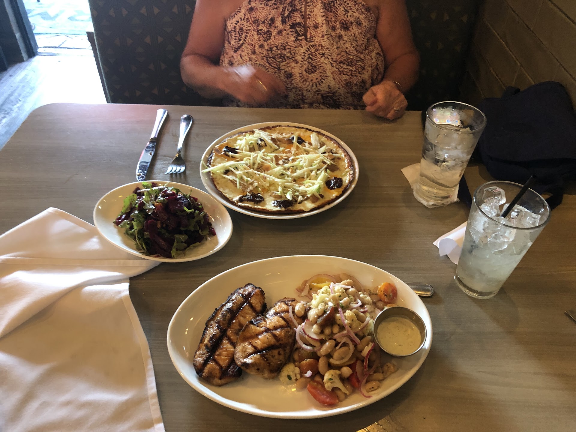 My mom got the chicken and waffles. I’m not sure why they put the apple slaw on top of the waffle or why they wouldn’t let diners know that is how that’s going to be served , it comes with this spicy sauce which taste like spicy watered down honey. My mom said the chicken was dry, but she did find the breading to be tasty.