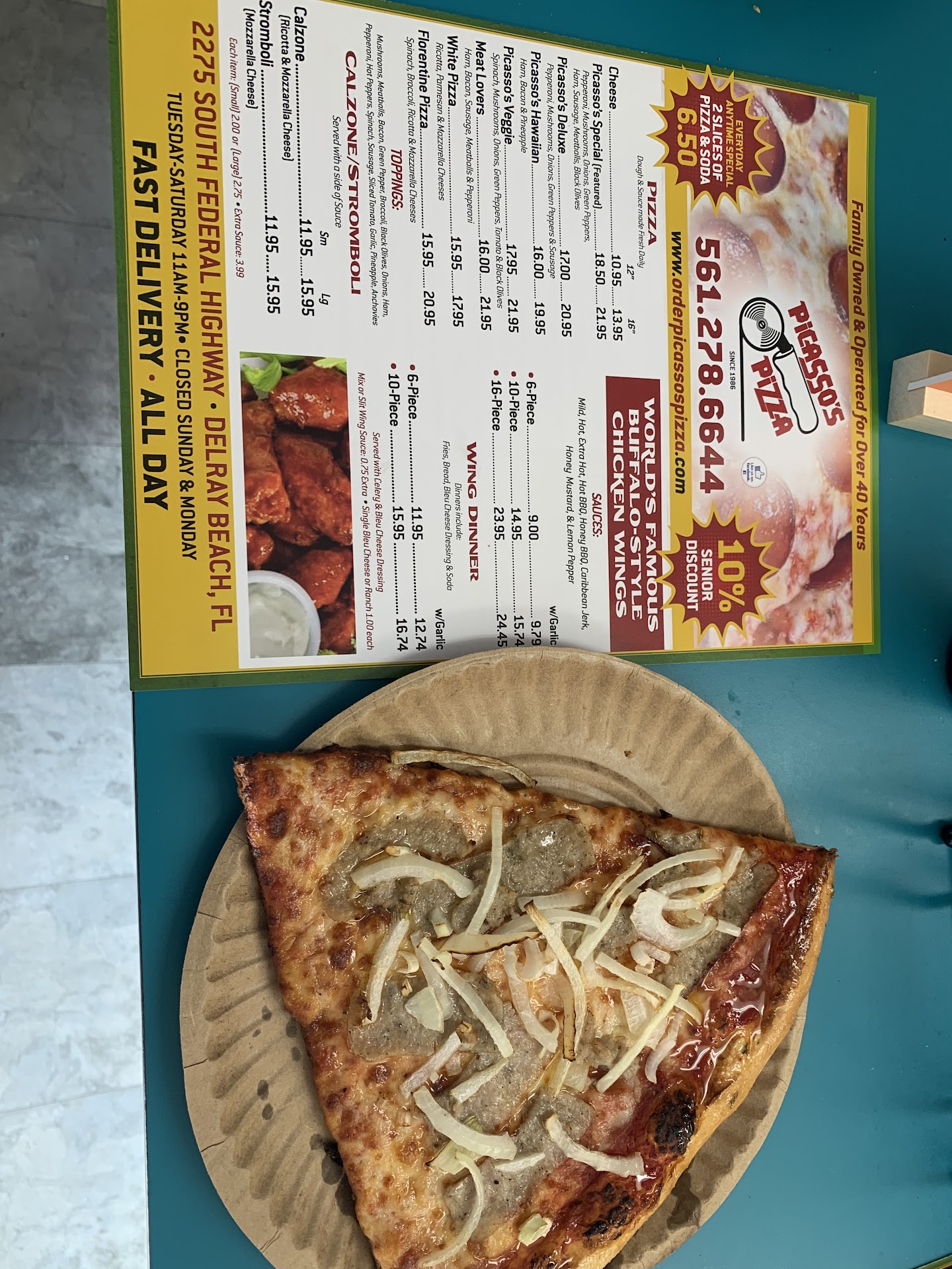 Read moreClaudio and his sweet wife Barbara, are two of the nicest business owners I have met, and their entire staff is just as friendly. I work locally up the way from Picassoâs, and when I decided to try their two slice and drink combo, it was one of the best decisions Iâve ever made! Quick pickup times (no more than about 10 minutes, great for my lunch breaks), delicious food, and at a great price. I highly recommend the pizza and wings (which also are finger licking good!). #supportlocalbusinesses by getting pizza or wings from Picassoâs, and you can tell them Zack sent you :) Iâm now a regular and wouldnât look elsewhere to find pizza that tastes better, wings that are juicier, or service that is friendlier, because Picassoâs is a masterpiece of all the right...