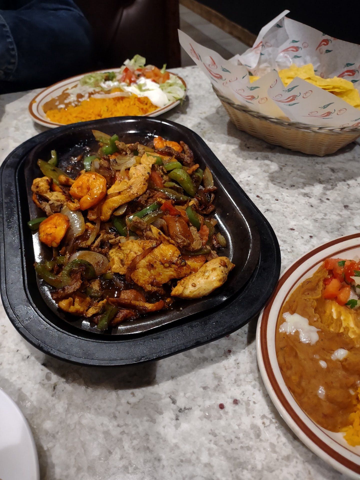 First time here. Was greeted warmly and promptly. We arrived around 3pm and there were at least 10 other guests there. The restaurant was very clean and nicely decorated. We were seated very quickly. Our server was hard to understand due to a thick Mexican accent and hard to hear over the loud music. We munched on the warm tortilla chips and fresh... oh soooo delicious... housemade salsa. (It has a slight kick to it!) The restaurant has a very large menu that offers a selection of the typical Mexican dishes. We ordered the steak and shrimp fajitas and white queso dip. We were both very disappointed in the queso...it was very runny and thin. Unfortunately, we sent it back to the kitchen. The fajitas came out quickly, sizzling on the platter...with red & green bell peppers, onions, strips of steak and 6 shrimp. The shrimp were an odd orange color, but were very tasty and perfectly cooked. This was served with refried beans, Spanish rice (not impressed) fresh made pico de gallo, quacomole and sour cream. The tortillas were warm...but very thin and of low quality. Thier drink selection is typical of restaurant offerings...but, their drink prices were a bit too high for the atmosphere. Our meal plus a glass of tea was $25. Over all, it was a great meal and I would recommend this restaurant to anyone looking for good...