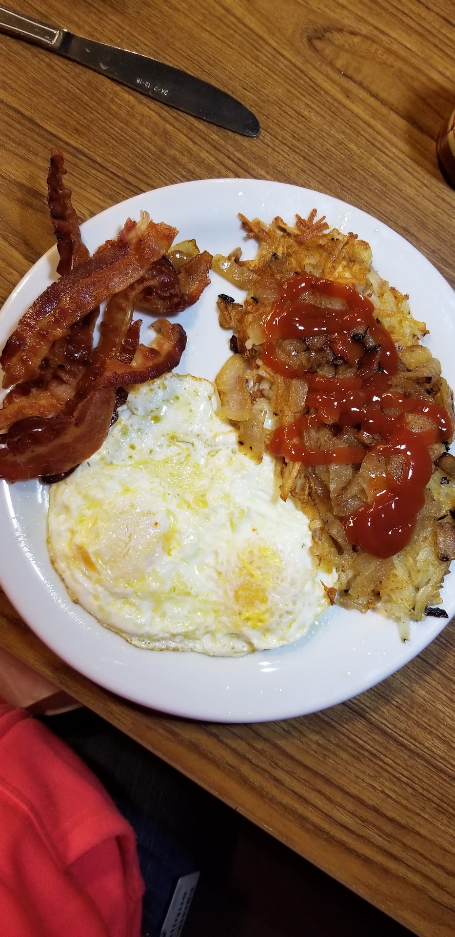 Read moreHuge let down. There was a time Dennys was "The America Diner" where everything came out hot fresh and almost a home cooked meal. Many nights spent there with friends enjoying kind wait staff and friendly cooks. Well that illusion is Shattered when you go here. Host don't greet you it's almost as if they're stuck remembering the 6 ft policy. When you are greeted your rushed to a table with only as much as a "how many, this way". Okay ignore the host. Let's fast forward to the waitress herself. Super rushed felt as if we weren't important. Once our order was placed I'd felt confident it couldn't possibly go wrong. Short stack, bacon, French toast (bigger size then I'd hoped since they cut the small menu) and hashbrowns. Food gets to the table I'm missing pancakes. I mention it to the waitress and she said "you want those AND all this?" Well I did... I figured split my hashbrowns and cakes to take home right? Not so much after someone insinuates you're fat based of the size of your order. An oder which was easier about 2 years ago. 1 cake 1 French toast slice 2 pieces of bacon and am order of hashbrowns. Now you can't get al carte orders. No single cake no single toast. Order large. Why to be criticized? Needless to say my chunky butt made sure to eat as much as I could seeming as I felt it was after all what she thought I was after. Ducking my head in shame I swore to never go back. Thankfully mu girlfriend stayed to handle things. I'm not tiny(180lbs) I don't believe in the word "fat" or implying people are. Dennys wait staff should ask you to order more and more not question and imply you've ordered to much. Never will I go back. If these things don't deter you away their cold half cooked turkey bacon, pancake puppies or half sized overcooked pancakes will. Food that's not cooked right, rude staff. It's...