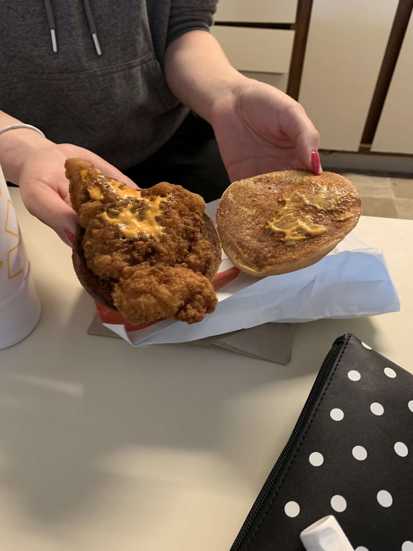 The McDouble was more like a McTriple, with all that grease not drained from the burgers... Mind you, I wasn't even supposed to have a McDouble... But lunch is lunch, and I had to eat something... I was almost handed my McFrappe when the employee then said: âWould you like me to wipe that off for you?â. I then responded, âYes, please. I don't want a mess in my carâ. I mean, who wouldn't want their drinks all cleaned off and not sticky?