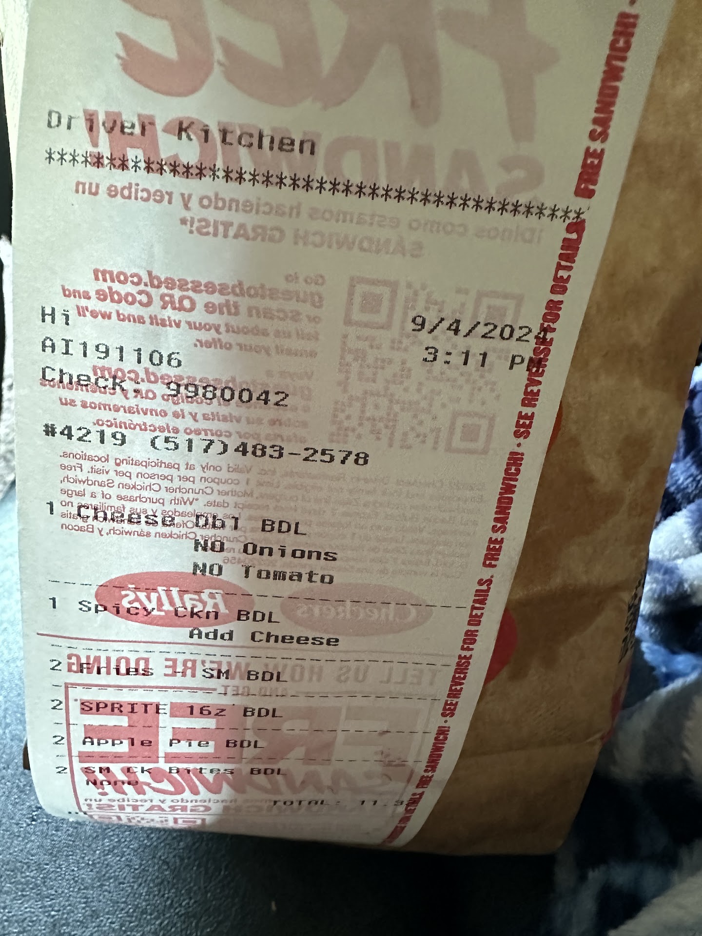 Food was good but the woman who took our order acted confused like she couldn't hear or couldn't understand what was said for the order whilst taken. Ordered a #1, two #2's, and a plain cheeseburger just meat and cheese for our Dog... we got 3 drinks and 2 meals and a plain burger 4 the dog at the hand out window. Found out the secondary #2 wasn't even on the receipt and we weren't charged. Was told we'd hafta pull around again because orders for drive thru cannot be adjusted at the window.... and there was no cheese on the dogs plain cheese burger.... Why were we charged for the cheese but did not get it? We pulled around and made an order for a #2 minus the drink because we already received a 3rd drink. Order taking woman acted like we spoke a foreign language so to move things faster we ended up having to order the #2 sandwich and fry instead of the # 2 meal because the woman couldn't and wouldn't understand a simple order and explanation..... so we ended up paying more money than what a combo meal would cost at the end because your staff isn't properly trained or is high as hell on marijuana... In any event? We will not recommend this west Saginaw location to anyone that we know. Also, we will be relocating our business to the South Martin Luther King Jr. Blvd. Location. Not only does the staff there get the orders accurate but the staff at MLK JR BLVD are super nice and KNOW what they...