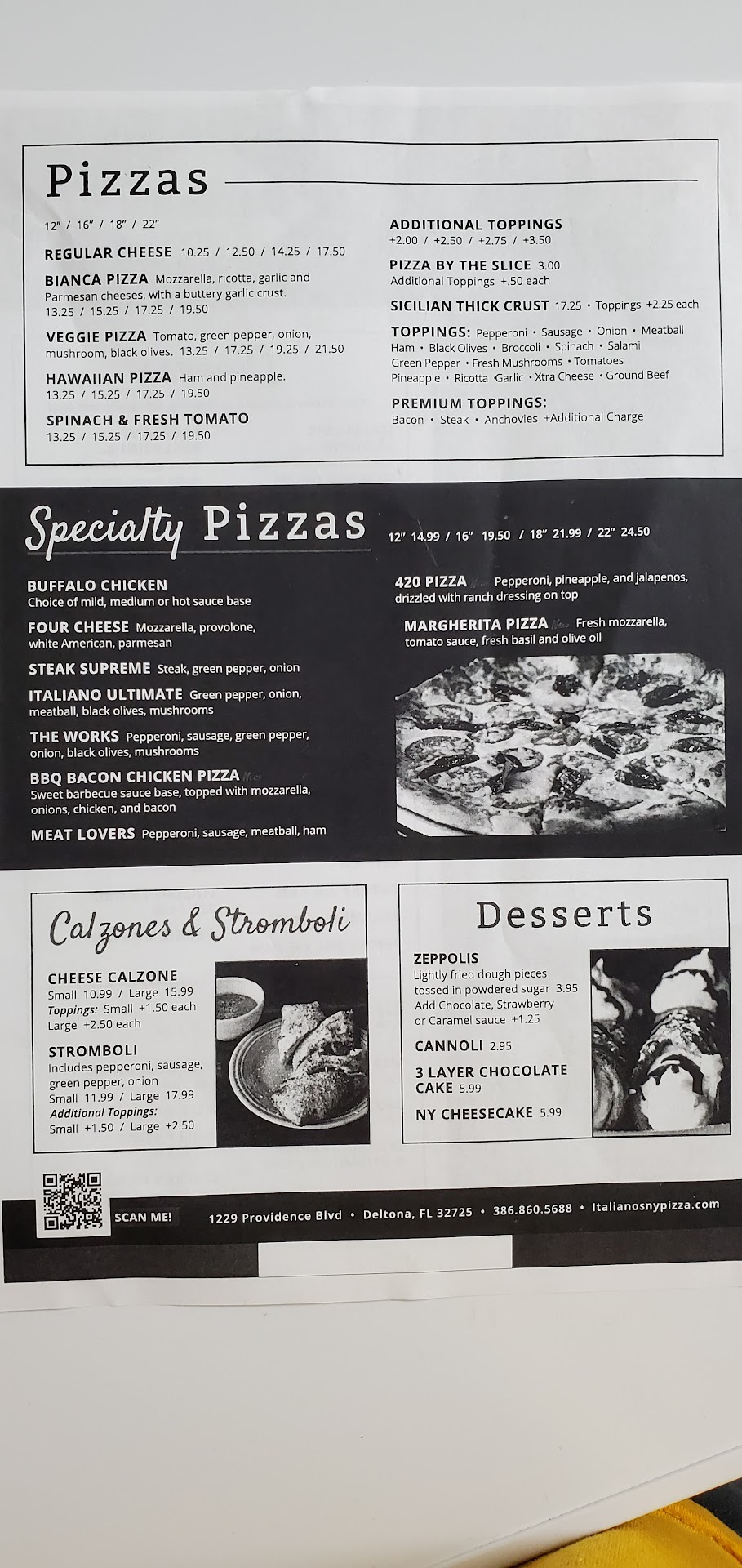 I'm the owner and what is really irritating is when people just post a rating and give no explanation for it.....this is for people to express their opinion of what you experienced and these people out there that post reviews if you notice they are actually being paid to write reviews! My best suggestion is come try us for yourself and make your own opinion! 04/05/19 Unfortunately Google will no longer let me respond to reviews on this website unless I pay them, so I'm just adding to my post and respond to the reviews in this manner. There is one posted last night stating something about us using frozen cheese.....this is far from the truth, please don't post something that you know nothing about, my restaurant gets our mozzarella cheese in 6# blocks and is refrigerated upon arrival. We shred our own cheese here as needed. Our dough is made fresh every day, nothing is frozen as far as our pizzas go. 7/31/19 To Brian Morgan.....you called and complained about the pineapple on your pizza and I offered to make it right for you by asking you what you wanted me to do for you and you got very abrasive and didn't want anything but just wanted to complain.....so in the interim you posted a negative review at which time I sent you the expiration date of the can of pineapple your order came from....which I understand that you can't always go by expiration dates but in this case the pineapple wasn't due to expire until 2021......So given that I informed you that people that post negative reviews without including the facts are now subject to a libel suit for defamation and or slanderous of a business. It's already been proven that, via a lawsuit filed in Deland against a business where the person that posted a negative review without posting FACTS was sued and it wound up costing that person $26000 for slandering a business. I always work with my customers! I myself took the phone call from the person posting the review and was very cordial and he was very understanding given the fact we were closing in 20 minutes. I did offer to remake it for him. I did give him a discount for his next order and he was satisfied with that. However even after our conversation he still posts something that is not how things went. I always work with my customers to resolve all issues! In response to Brian Logan 07/31/2019....I don't know what more I can do for you and to just blow me off and post this is irresponsible and defame me as a owner...I've tried reaching out to you and you won't hear it and hung up on me....be careful what you post! 08/30/2019 In response to Arnaldo Rosario's post.....I'm the owner of Italiano's Pizza and you posted a review on Google. You made a blanket statement that people are rude but which people are you referring to? There are a lot of rude people out there and my staff is very friendly, but you posted a blanket statement with no explanation! As far as cleanliness you can look up on the Florida Dept of Restaurants and Hotels website and look at my health inspections since I have owned it almost 7 years! I would appreciate much better itemized problems that you may have witnessed so I can correct them! I It is unfair to my business to just put a post like this with no explanation! 09/06/19 To Lisa Grenier....what are you talking about? My menu has been the same for the last 5 yrs nothing has...
