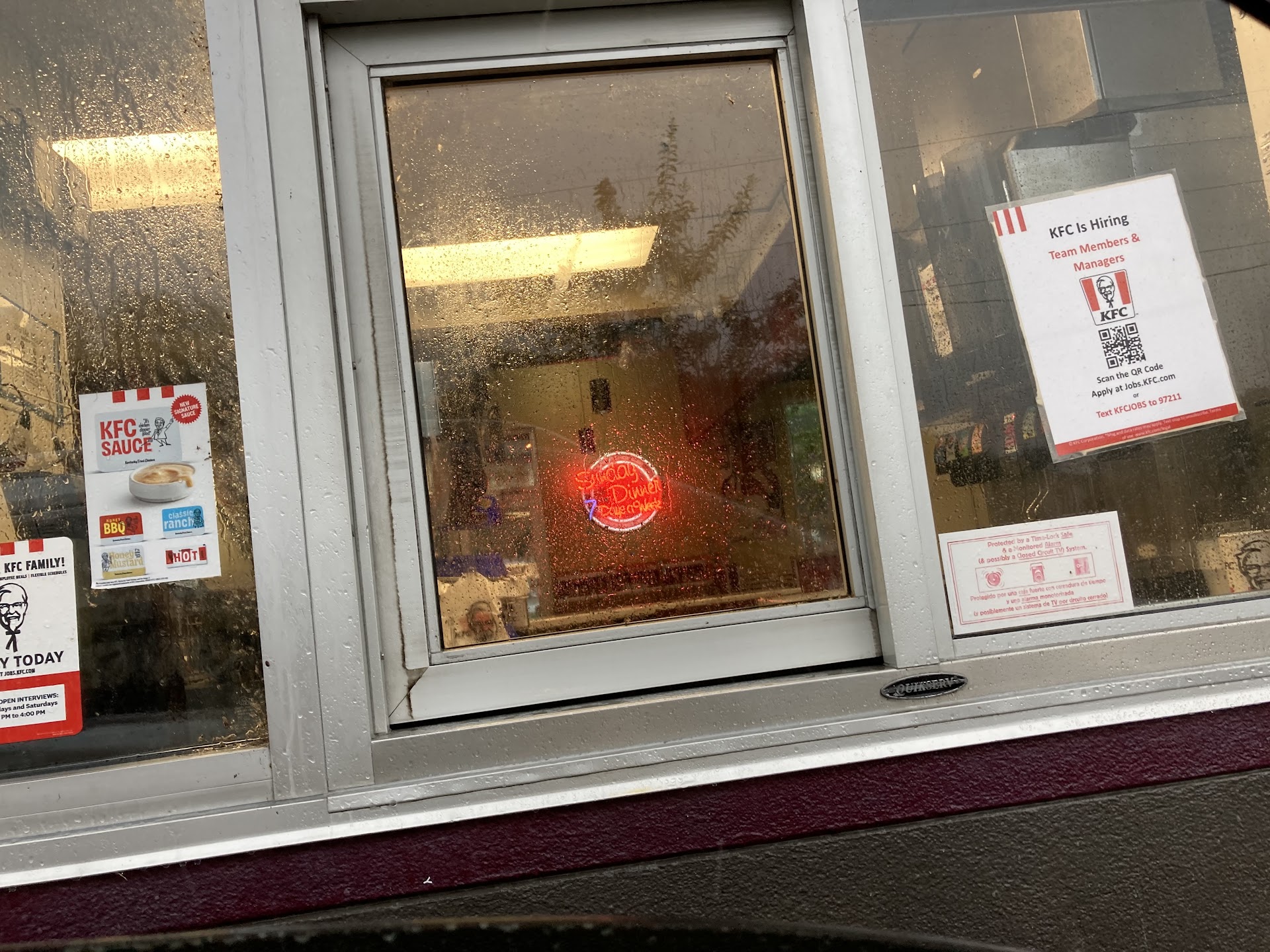 06/13/2021 We waited 24 minutes in the drive through line to get to the menu board, only to find it was not working. We pulled to the window and Isis said they had no working headsets. We order two eight price meals, one original and one extra crispy. She said they did not have enough original chicken. They apparently did not serve any cars ahead of us in twenty minutes and they had no chicken. I told her just to give us what chicken they had. She came back and said the chicken was cooking and it would be a seven minute wait. Really, we used to come to Kentucky Fried Chicken 50 years ago on Sunday and they always knew to to have enough chicken cooked for a meal period. My grandkids just complain when we come to KFC because they know it is going to be a long wait. We finally got our food 41 minutes after we arrived. The car that was behind us in line had pulled forward but there was no way out of the driveway for them. As we left they drove passed the window. We could see the line was into the street and cars were going around cars waiting to place their order. No one at anytime let us know the menu board was not taking orders. I hope the food is good but who really know what is going on at this KFC.
