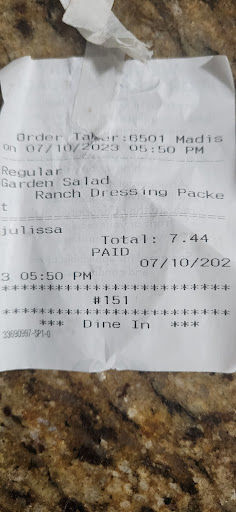 Read moreI ordered a Garden Pizza, the Lady gives me a salad and when I turned back to let them know they tell me that they will replace my order with the Pizza and NEVER DO. I spent 45 minutes waiting, when I walk again at the cashier I ask if it will take long, 1st lady do not answer and never came back to let me know what is going on, the guy that said will take my order, after standing for 10 minutes, comes back with another salad in hands and doesnt say anything and goes to the back, after waiting for somebody to be kind enough to tell me something I decide to leave and he followed me outside at the door of the store and tells me it will be ready in 5 minutes, he will bring it and apologies, I offered to go in one more time to pick up the Pizza that I ordered and they NEVER DID! and expressed that it was disrespectful, he insisted to bring it out and guess what? I waited 13 minutes, he walked out of the store and didn't said a word. Worst experience ever! DO NOT RECOMMEND AT ALL. IT WAS SO DISRESPECTFUL I'm short in words. Notice the receipt on the salad she gave me says 5:50PM and I left at 7:00 PM ( an hour and 10 minutes wasted to be...
