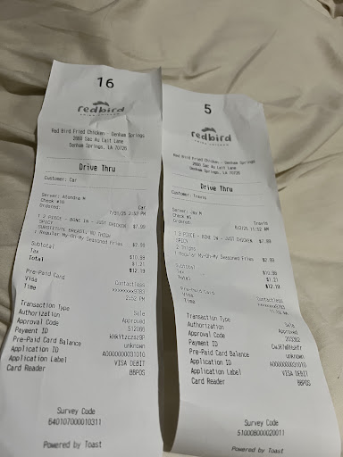 Read moreWent to Redbird Fried Chicken in Denham Springs from a recommendation of a friend. The service was good. We ordered an 8 piece bone in half spicy / half regular they gave us 3 wings / 2 legs regular & 1 breast 2 thighs. The breast, thighs & 1 leg where VERY dry like they where sitting under the heat lamp for a while the other 4 pieces where dry also. Ordered a LARGE of each: Mac & cheese which was a 12 oz container with 8 oz in it and (2) 4oz containers of cole slaw. Spent over $40. Looks like this place gets good reviews but this was some of the worst fried chicken I have had in a long time. I'm not sure how either of the sides qualifies as a large when they where not enough for 2 adults. VERY...
