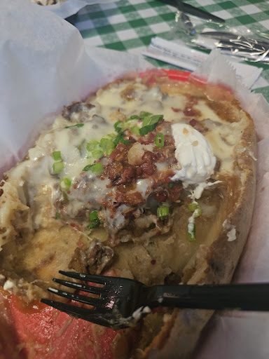 We got a pulled pork potato and a burger with "potato salad." I put potato salad in quotes because it was literally mashed potatoes with some pickles. There were NO chunks of potatoes, no mustard, nothing but pickles. The potato was ok. The burger was a premade patty like you might get from Sam's. They charge $1.25 to add cheese. They covered about half the burger with shredded cheese. Not $1.25 worth of cheese; they gave us more when requested, but of course it was cold and now we have cold shredded cheese on the $9 burger. We were sitting right next to the kitchen door. The employee walked out of the kitchen, past our table, to the front counter, answered the phone, then several minutes later brought my food to me that she had had in her hands when she passed our table. This was easily the driest burger I've ever eaten. Side note: the employee who took our order had very dirty fingernails. The problem is she then went in the back and was prepping our food. Suffice it to say that this place is ONLY for potatoes, and even then the cleanliness of the kitchen is questionable. PS: on their menu, they list "butter" in quotes. This means they are not using actual butter. PS 2: it was easily 80°+ degrees in there. They had a fan set up on one of the tables. When it's 100° outside, you need to have working air...