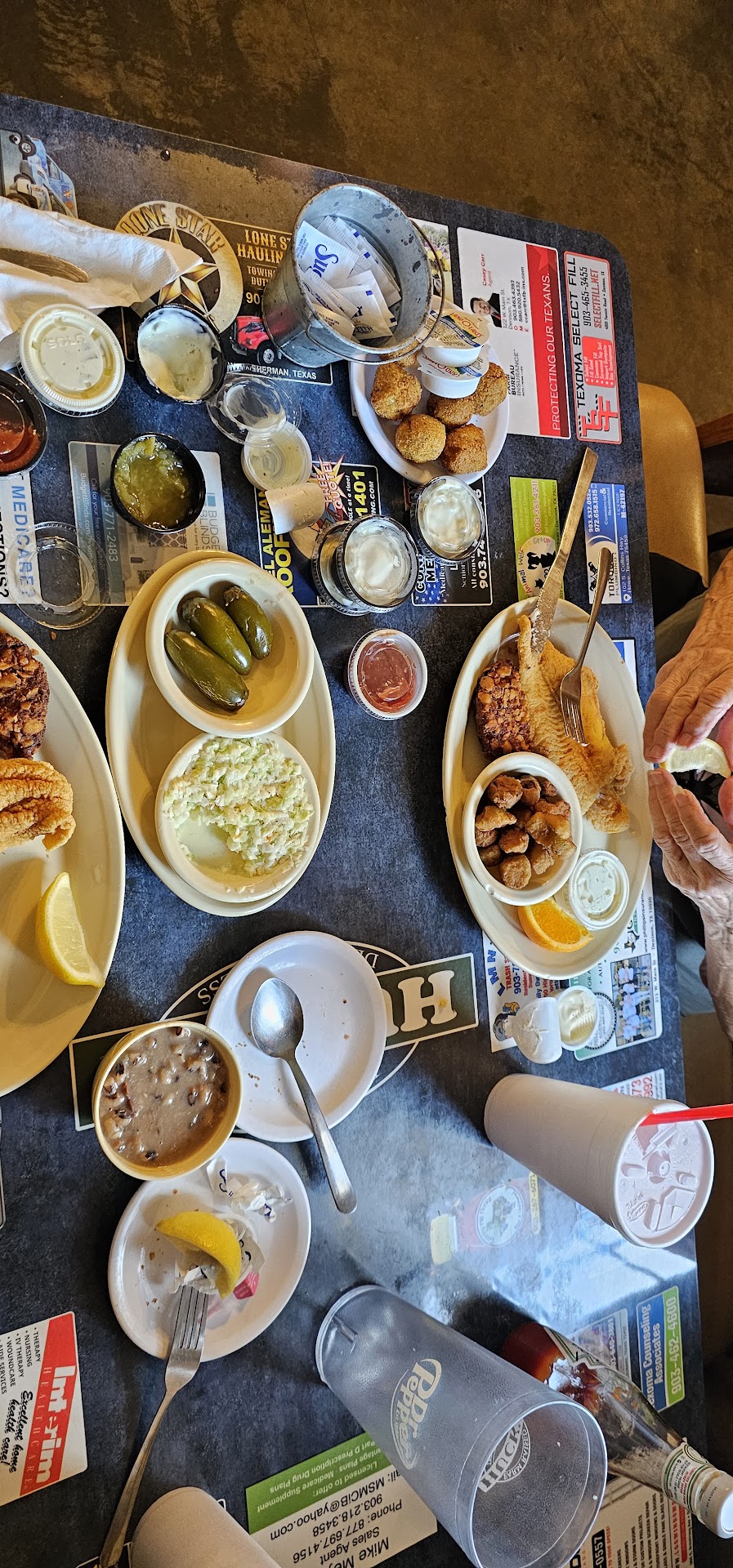 Read moreI've been going to Huck's Catfish since it was located in Pottsboro, TX. Last night, 10-25-25, was the first time I've stuck to the floor! Every person that walked through the north dining room was sticking to the floor because it was so dirty. I guess the new owner doesn't know what hot soapy water and a mop is for. The food was as it's always been. No complaints. The service wasn't great. Our server spent her time hanging out at the corner of the entrance between the dining room and kitchen. I ordered two drinks, a tea and water. My wife and I needed drink refills. She came by the table, and didn't notice that all three drinks were empty. My wife asked for a refill. She returned to the table, filled my wife's drink, and left my two empties! I had to flag down another server to get my water refilled. After a less than pleasurable dining experience, and listening to the shoes pop loose from the floor, I went to the front to pay my tab. You can see into the kitchen, and it sure looks darker than I remember, with grease coating the walls. How this place is passing health inspection...