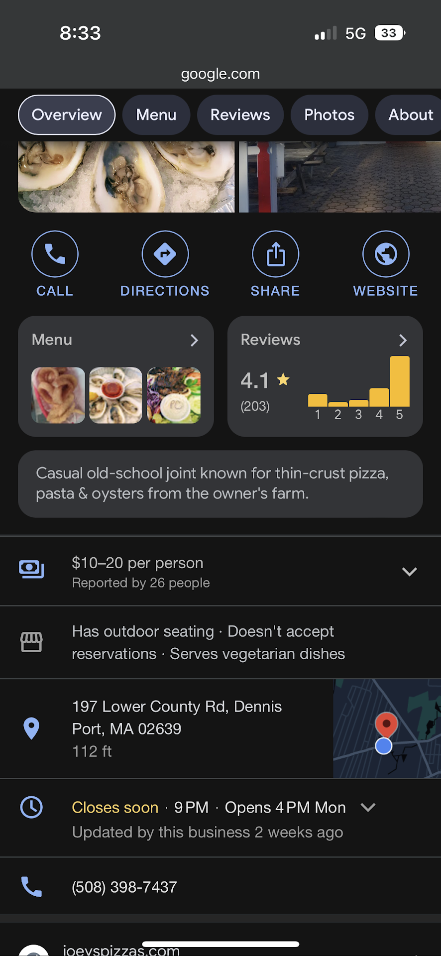 This restaurant was once owned by another Joey. After leaving the location years ago, Joey Cardillo returned to his original location since 1976, and opened Paradise Pizza about 3 miles down the street. See my review. Both restaurants are easy to get to from Route 28, School St. or Lower County Rd. If you live here or have been visiting for several years, you know about them. For newer or first time visitors, try both restaurants. Experience their different styles of pizza and Italian foods plus other great menu items. Both great...