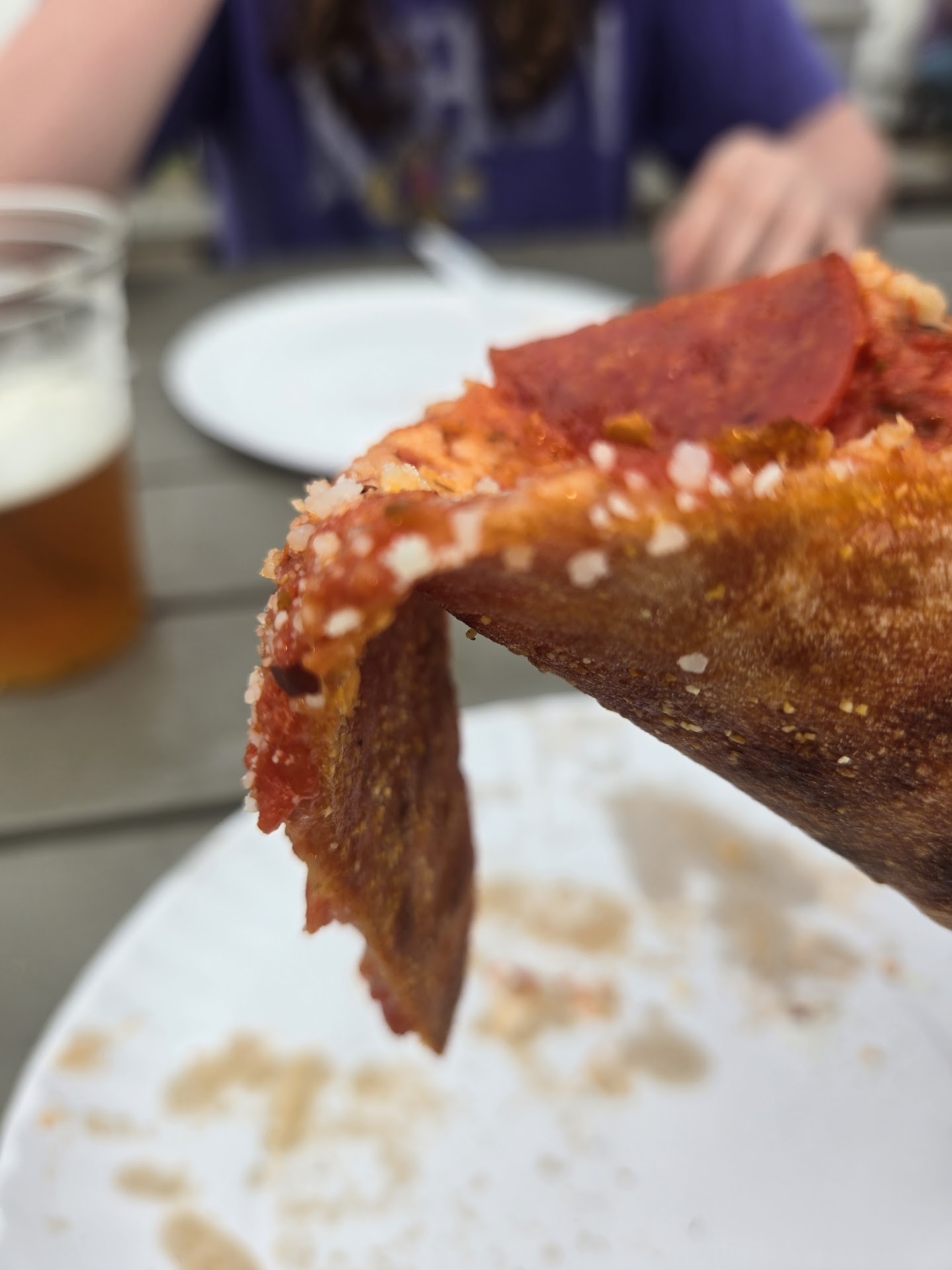 For the materials used, I found it overpriced. We ordered a Buffalo chicken pie. There’s a modicum of dough used. A bit of hot sauce. Some cheese. The chicken was diced chopped up tiny bits of chicken. It’s hard to explain. Microscopic cubed chicken? It was odd. If you get the Buffalo chicken it appears to be tomato sauce with hot sauce added, or just hot sauce. It’s not really pure Buffalo sauce because it’s red, not orange, and it’s very spicy. In short, recommend skip the Buffalo pie. Get plain cheese or something to that effect.