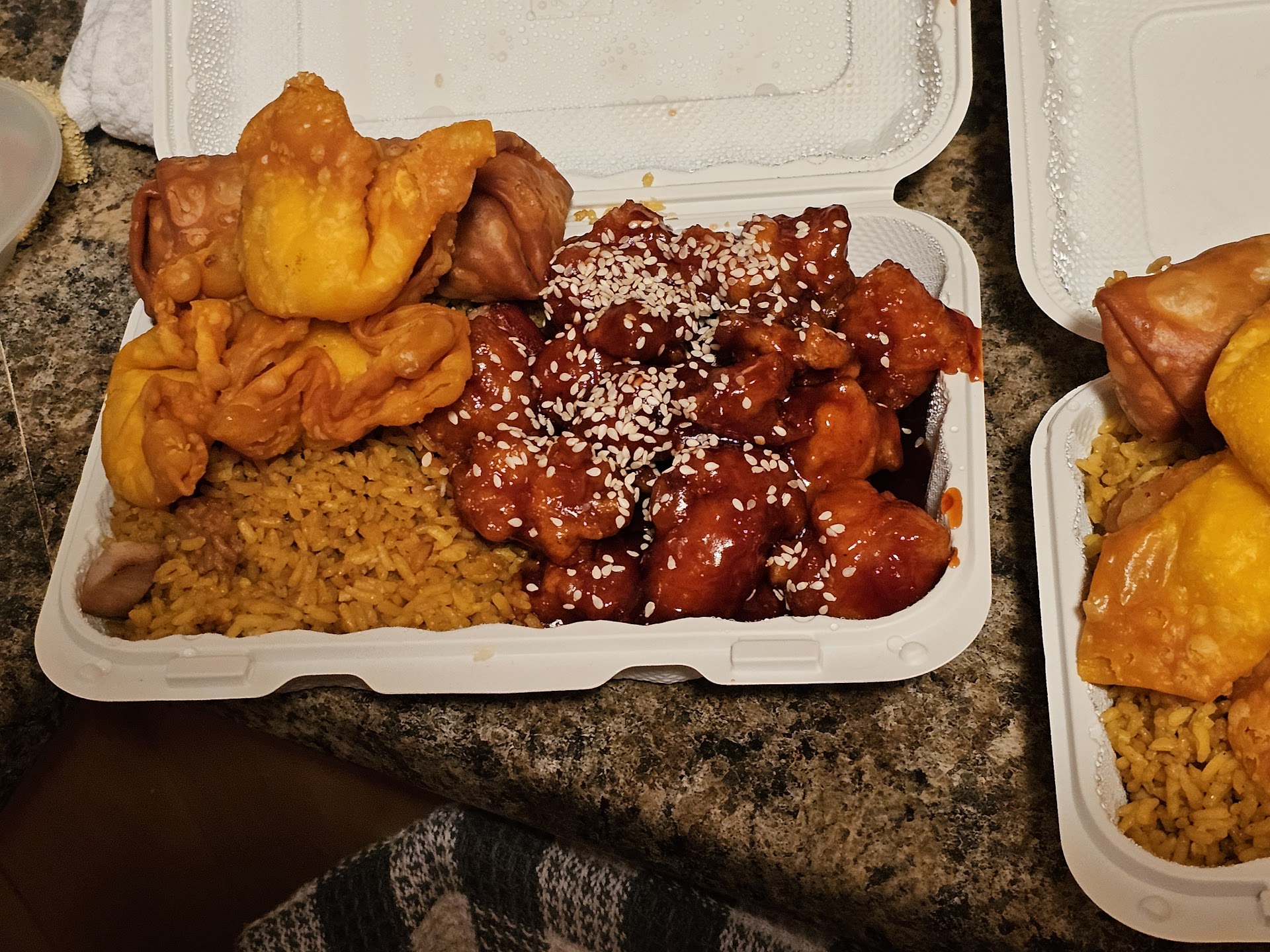 I get that this is chinese takeout but places don't have anywhere for you to sit because they have cases of to go boxes piled high everywhere? I know .. covid but come on.... Also, they set my daughter's order with someone else's order, on the one chair in the dining room, and that someone was angry and had been waiting took his and hers so she had to wait to have it made again. It's pretty frustrating that they can't keep the orders on the counter? IDK, maybe I'm not ready for a new normal. Food was just ok. I'm not a fan of crab rangoons with no flavor and made with egg roll wraps instead of spring roll wraps. My egg foo young already had the gravy on it and the cabbage was super tough so it was horrible to eat. My friends moo shu was great but we didn't get our white rice. Spare ribs were made on the spot, I could see the guy making them and they were very good. Place was very clean. That's a plus!!!! All in all it was fine... We spent 150 for 5 people for take out on the cape and I think we overpaid but I'm not here much. I've had worse meals and way...