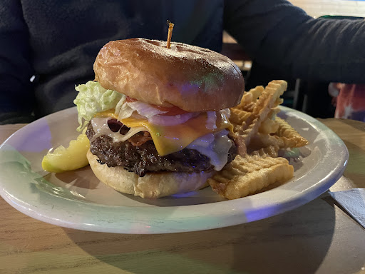 My wife and I each ordered the infamous house-made, “Pressure Crack Burger” and it did not disappoint. The ingredients aren’t overwhelmingly wild but the flavor is excellent. I.e. 1/2 burger, bacon, Swiss and American cheese, mustard, mayo, lettuce. The setting itself was like a bar locals attend, with a corner group of guys near the business entrance that were quite rowdy, which was distracting for sure. Honestly, the one guy’s behavior (on memorial weekend in the evening, thus drunk) was uncalled for and the servers behind the bar showed the disapproval on their faces. My wife and I, however, were treated well, with timely but not obnoxious check-ins from our waitress. Overall the food was excellent! I also had a Sam Adam’s Cherry Wheat beer they had on tap, and it was top notch, alongside my burger and an enormous amount of crispy fries we were served. The music was a good mix of oldies rock and some Elvis mixed in. I was quite frustrated with the loud and obnoxious corner crowd, but that wasn’t really the bar’s fault. As a bar owner, I would’ve been on the edge of having the police remove the one man for disorderly conduct they way he was behaving, but that could be a bad look for business. I certainly wouldn’t let one instance on a very busy weekend distract from going back there in the future! To summarize: the food was awesome |the onion ring appetizer, to the burger and fries, and beer| the music was good, and the waitress (though dressed a bit edgy) was extremely kind and attentive, and the food wasn’t a very long wait....