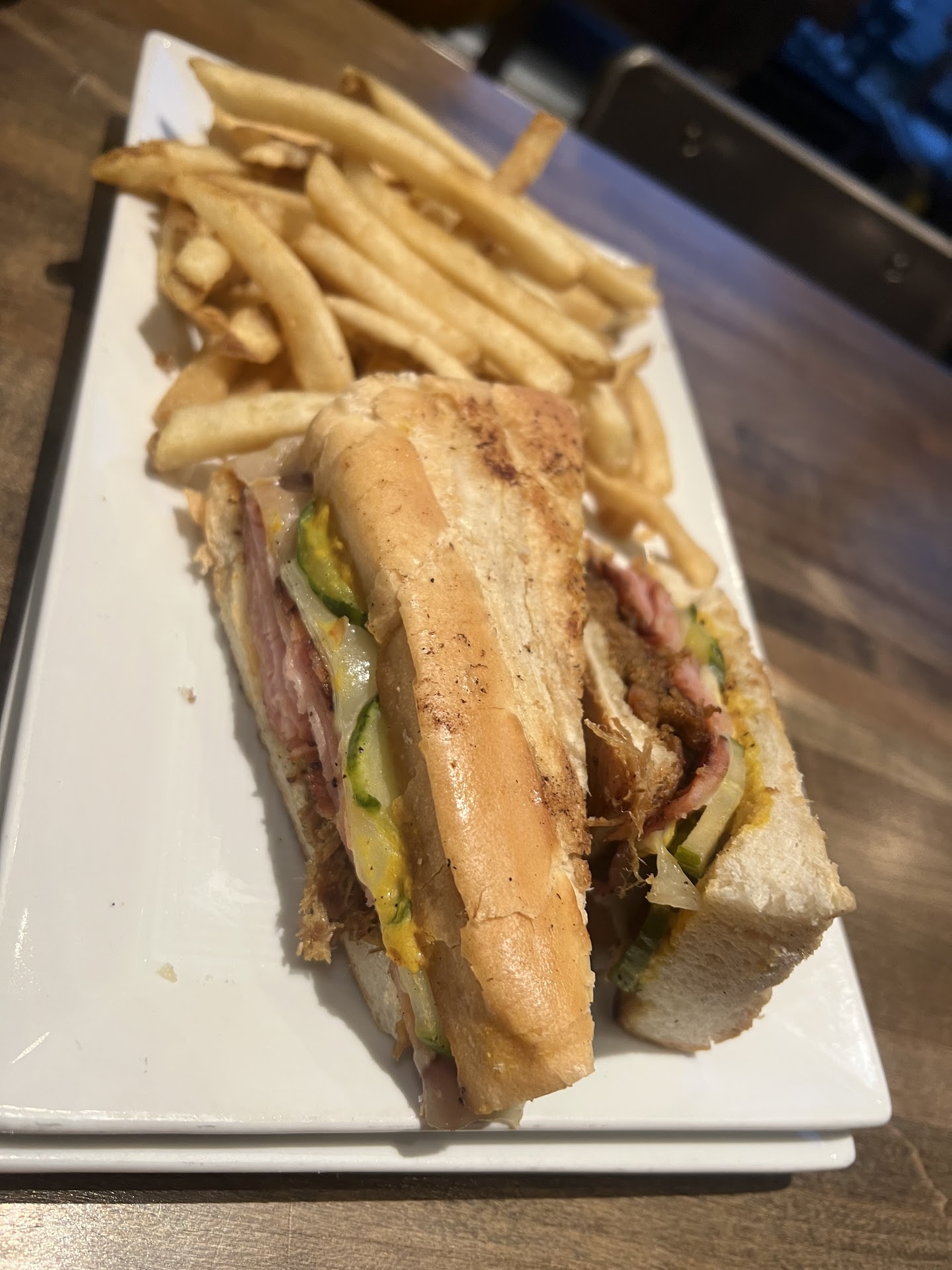 My mom and I ordered two meals to split; the shrimp carbonara and the cuban (a special for the day). My mom told our server, Brooklyn, we were sharing both food items. She did not state to bring them out one at a time. The bread of the cuban tasted stale and was rather tough to chew. The pulled pork didn't have much flavor. Overall the sandwich was very dry. The fries were decent; nothing exceptional about them. Brooklyn never checked on us after dropping the food off.
