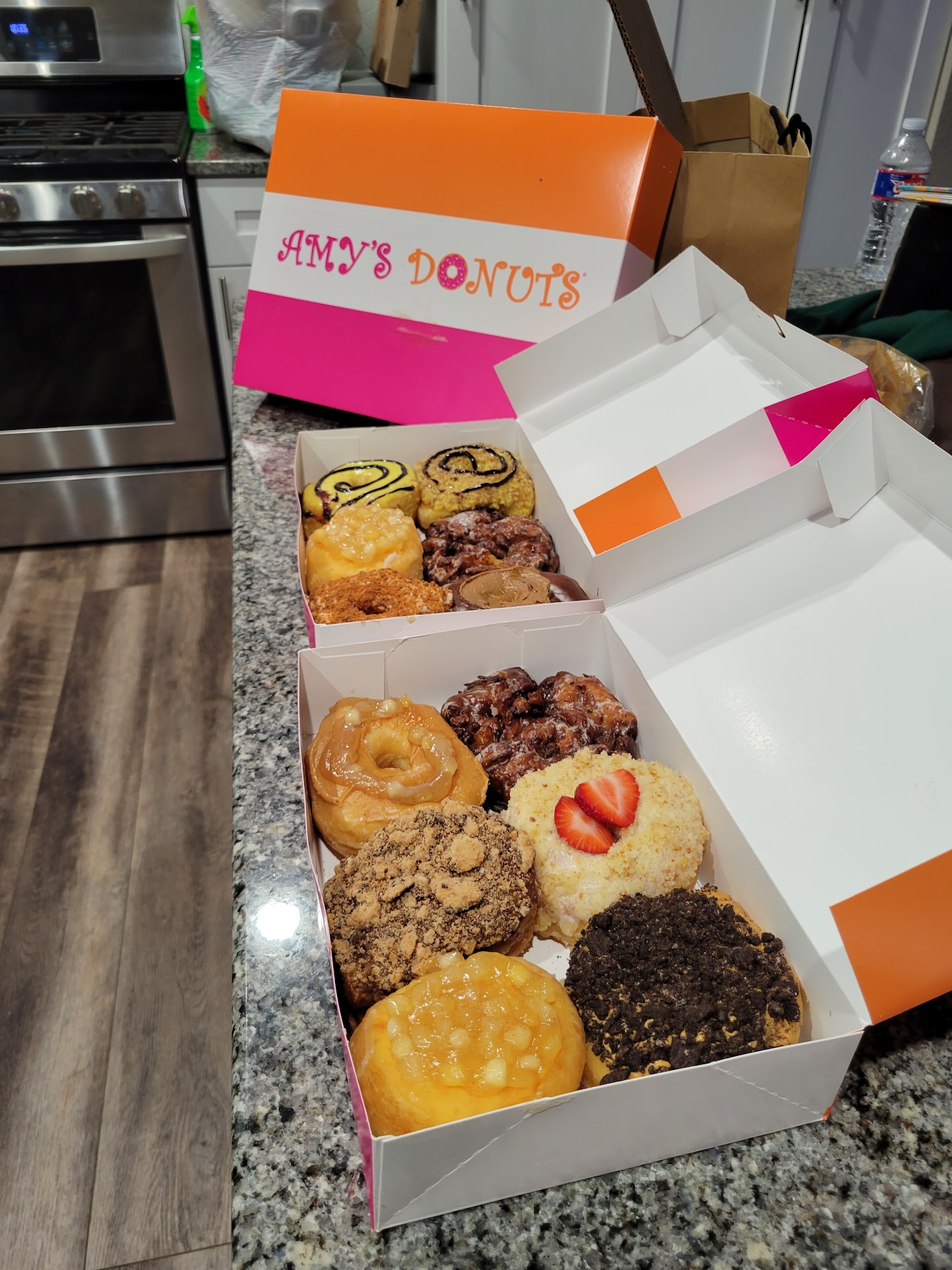 Ā Ā Ā Read moreMy husband and I have been wanting to try Amy's Donuts for a while now so I went to pick up some donuts and was excited to try them and the fact that they're open all day was a plus! I walked in & there was a family in front of me with at least 4 kids & I didn't know the options bc I'd never been there. I couldn't even see the options & the kids were jumping and running around & being quite loud. I was not the only one having trouble looking at the donuts. It was finally my turn and it seemed like every kind I wanted was not available so I chose a few I thought would be good. The service was great, no complaint there at all.. but my husband and I were extremely disappointed. The donuts tasted like they had been sitting out for days and they hardly had any glaze on some. We couldn't even finish them bc they just weren't very good unfortunately. I paid $17 for everything which I thought was a little over priced so I will not be going back there or any other location. I'm sorry to say I would NOT recommend...