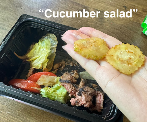 The Green Coconut Curry arrived just a few minutes after the Rolls did, almost in time with my last bite! The vegetables looked enticing, and the curry held this pastel green color with specs of fresh Thai chili peppers surfacing to meet my joyful gaze. The server also brought out a well-sized bowl of brown rice (to my specification as one could choose between white rice or brown rice to accompany the entree) at no extra cost. The traditional way of eating this dish, as I was told by the server, was to take a spoonful of rice and dip it into the curry- attempting to grab hold onto some of the vegetables, sauce, and meat as one brought the spoon out of the glowing curry. I did just that, and boy was I surprised. A punch of savory and spicy flavors coated my mouth while my tastebuds hurried to catch up to my appetite. I was as consumed by that bowl of curry as it was by me- fairly quickly. My need for warmth was met, and I could not have been any happier.