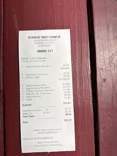 Read moreWe had a great experience at Bombay Indo Chinese in Denton! The food was fresh, flavorful, and perfectly cooked. The Chicken Hakka Noodles and Paneer Chilli were standouts—delicious seasoning and just the right amount of spice. The soups were comforting, and the fried rice was tasty and filling.