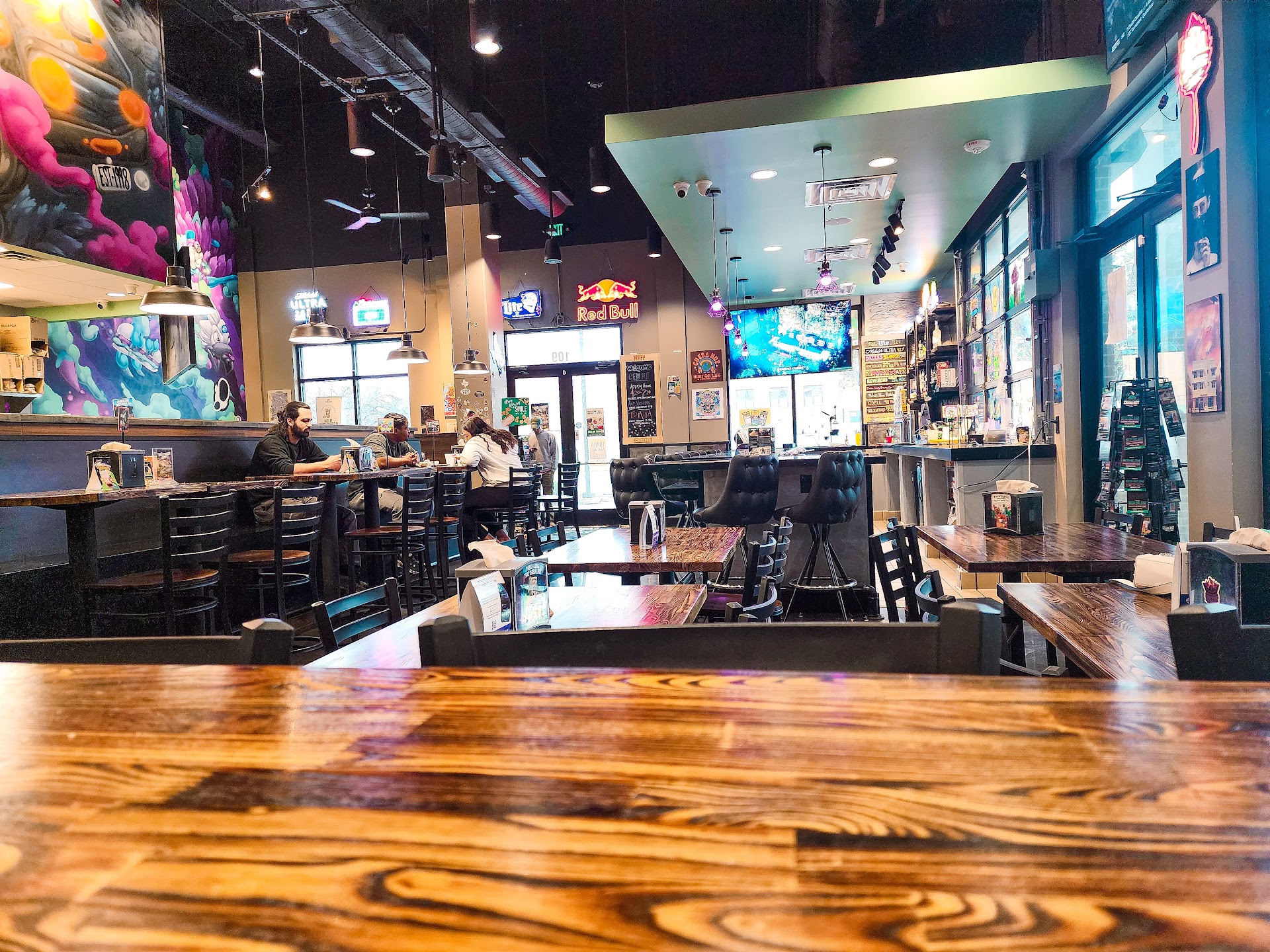 Cheba Hut goes all in on the themeing, which if you're 420 friendly may be amusing, but is not much of an attraction to someone who isn't into that lifestyle. But it is everywhere. Looking past the themeing the restaurant is set up nicely. Dark floors and walls with pops of color make the inside feel, small but cozy. There is a bar located inside the restaurant, along with a neat covered outdoor area with some seating, tvs and corn hole. I'm sure the night crowd is pretty fun.