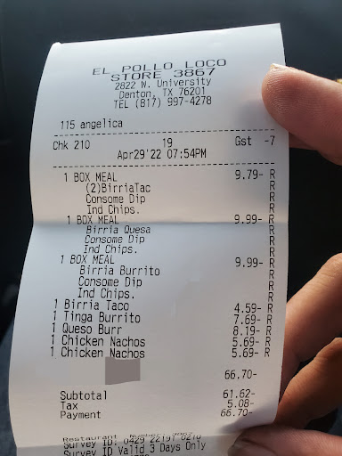Read moreI've been coming to El Pollo Loco since they first opened their first spot in Southern California. Since moving to Texas I was glad to discover this Pollo Loco in Denton county. Came in with a party of 5 for a Saturday night dinner as was my custom in California. I was in for a big surprise! I decided to try the holiday tray which included one tamale and 2 pieces of chicken. The tamale itself was something that clearly had come from the microwave...same taste you find at the frozen food isles at the store. It was tasteless and the filling was all mushy, yuke! The chicken looked more like pieces of quail. These tiny anemic pieces were tasteless and dry! Its like the taste of something that's been sitting out for a while. Certainly, not Texas size or even California size portions. The sauce selection was watery and in no way tasted like the sauce that gave Pollo Loco that special taste...same goes for the chicken, bland, dry and tasteless! Aside from the food quality being well below standard, the vibe in the restaurant was ghetto. Mexican food joints should NOT be playing hip hop! This is not the ambiance I want to experience when I enter a Mexican restaurant. Overall, I was very disappointed with our dining experience. Had I known the food was going to be that bad, I would have bought a $4.95 rotisserie chicken from Walmart. Instead I'm out $45, but promise I will NEVER be back and caution others...