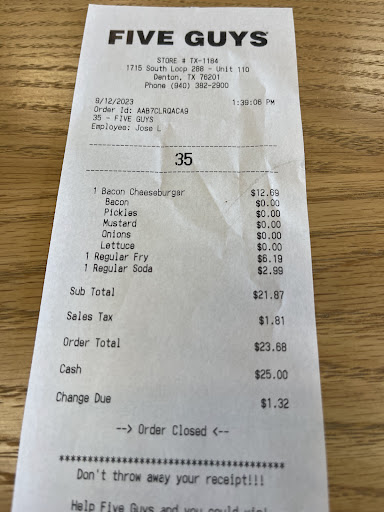 I recently went to Five Guys and ordered a bacon cheeseburger, regular fries, and a medium drink. The total came to $23.68, which I thought was a bit expensive for one person.