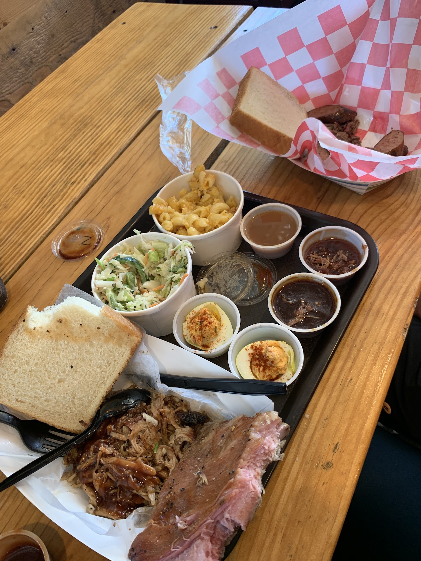 Read moreI've been here three times in four weeks. I could wax poetic about the second and third visits, but I feel I should tell you all about the first. I walked in, and was charmed by the decor, and the smell was pure heaven. I was greeted by a smiling fellow behind the register, and he patiently waited for me to take my order. I got the 'whole pig' platter with double brisket, an order of ribs, the smashed potato salad, and smoked mac n' cheese, washed down with hibiscus sweet tea. Let's begin: