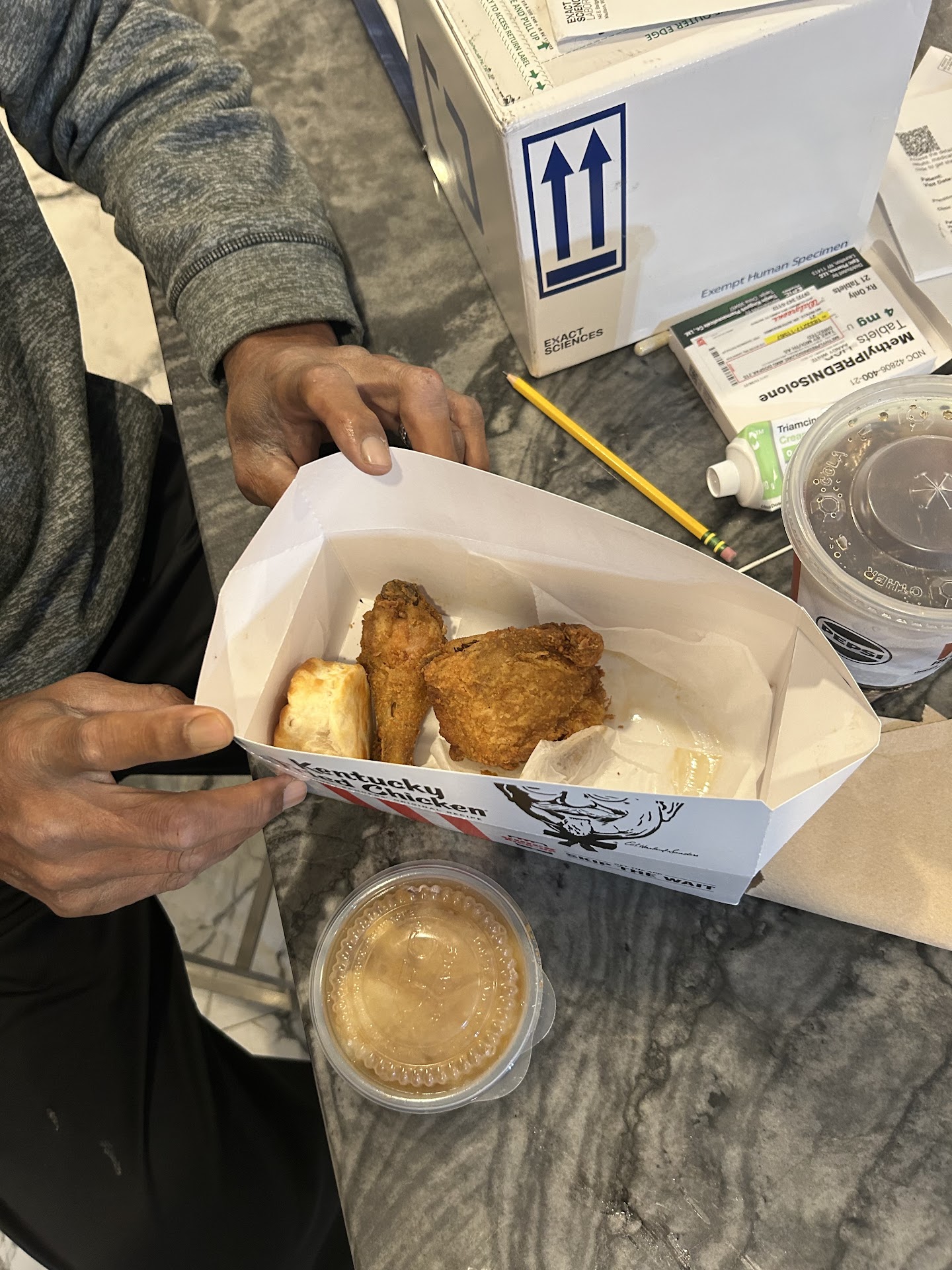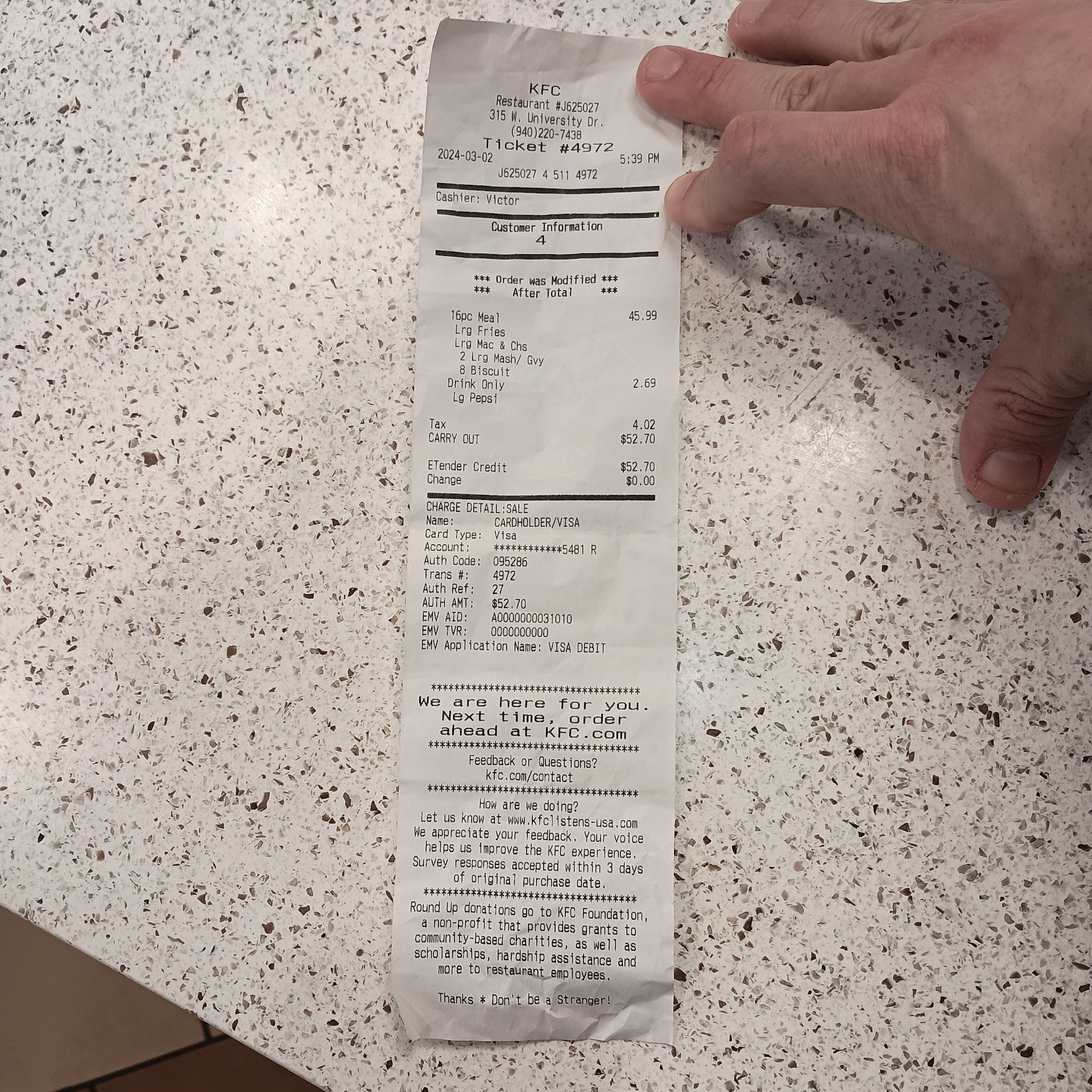 We then ask about just substituting the chicken tenders/nuggets and mashed potatoes for the bone-in chicken pieces she says they still have prepared and whatever sides they might have. We're not picky, we're flexible on food, we're just hungry and we've already paid. She informs us that no, she will not be substituting any of our food for anything else they still have available, nor will she cancel our order. She claims we can cancel the order on the email receipt from when we put in the order and to take it up with KFC that way. This is factually untrue; I checked the email, there is nothing in the entire message that even vaguely mentions or alludes to cancelling an order.