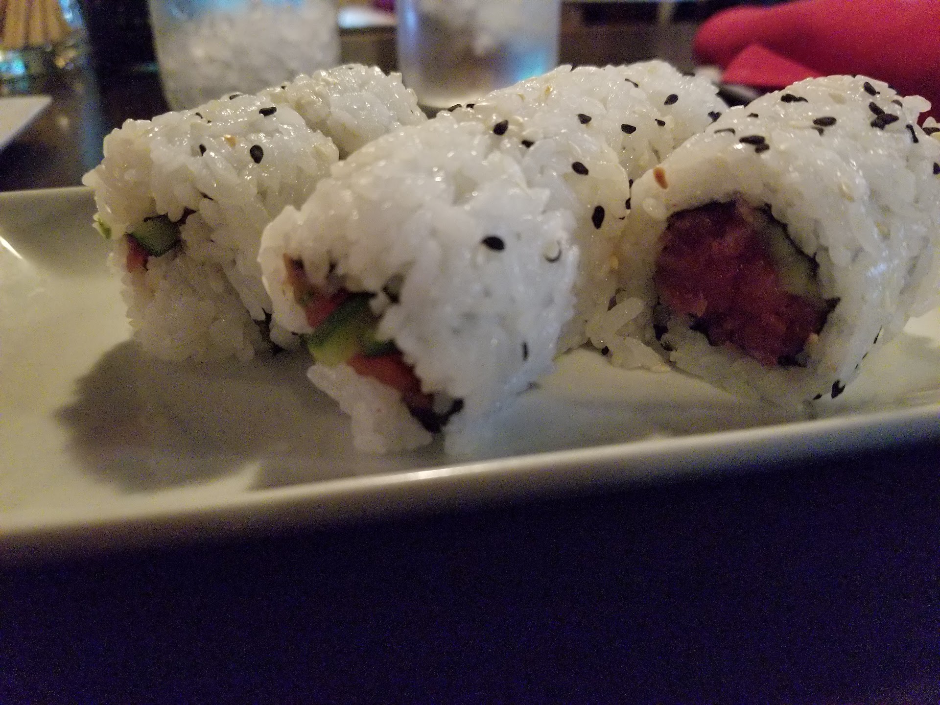 Read moreWhere to start...ok, let's do this. Came here on a Saturday night, interesting location down an ally with red lights out front. Restaurant was fairly full but we still snagged one of the last tables available. The service was ok, a bit slow though. Our coupon for a free appetizer was resended but not a deal breaker. Sushi menu is limited, which from a business aspect, is a fairly smart idea to limit the amount of waste. I ordered a spicy tuna roll and the shoyu ramen with crispy tofu. Girlfriend ordered the miso ramen with tofu. When it comes to sushi, I judge the place on the basics. If you can't get a simple roll correct, I'm not even going to try your other options. Spicy tuna roll came out first and was decent. Sushi rice was a little unevenly seasoned, but otherwise good. The ramen came out next and they were a little underwhelming. My girlfriend noted her ramen (miso) had the consistency of gravy. Having sampled it myself, I am assuming they added way too much miso. Her tofu also came out as "crispy" when she wanted normal. I say "crispy" because I was expecting pan seared crispy, which adds flavor. Our tofu was deep fried, which quickly becomes mushy in the broth. My shoyu ramen was also slightly thick but at the same time, bland. There wasn't a great deal of flavor that came through until I added the house made pepper sauce. Maybe skim some of the oil from the broth when initially cooking to lower the fat content. The oil will block the receptors on your tongue. Onto the noodles. These seemed slightly overcooked. There was no chew or bite to the noodles, but instead mushy and did not carry flavor from the broth. The eggs were perfectly soft boiled, and the corn was sweet. We didn't end up finishing our ramen unfortunately, nor did we elect to take the leftovers. We were disappointed considering how many great reviews we saw...