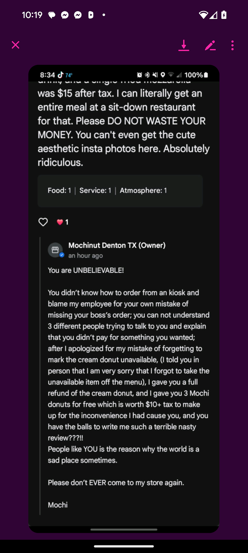 I’ve had some bad experiences at restaurants before, but this one takes the cake. From the moment I walked in, the employees were rude and dismissive. I placed my order at the kiosk, only to be told after paying that one of my items wasn’t available. Instead of offering a real solution, they just handed me free donuts I didn’t even want. And honestly? They tasted awful—they're chewy and no have flavor in my opinion. On top of that, the prices are ridiculous. $7 for one fried mozzarella stick? $15 for a basic boba and that single mozzarella stick? I could have had an actual meal at a nice sit-down restaurant for that price. Oh, and don’t be fooled by their advertising—their "cute" drinks come in boring plastic cups, nothing like what they show online. But the worst part? The owner’s unprofessional and downright nasty attitude. Instead of handling criticism like a business owner should, they decided to lash out at a paying customer in a public response. That’s a huge red flag. If this is how they treat people who spend money here, I’d hate to see how they handle actual mistakes. Take your money elsewhere—this place is absolutely...