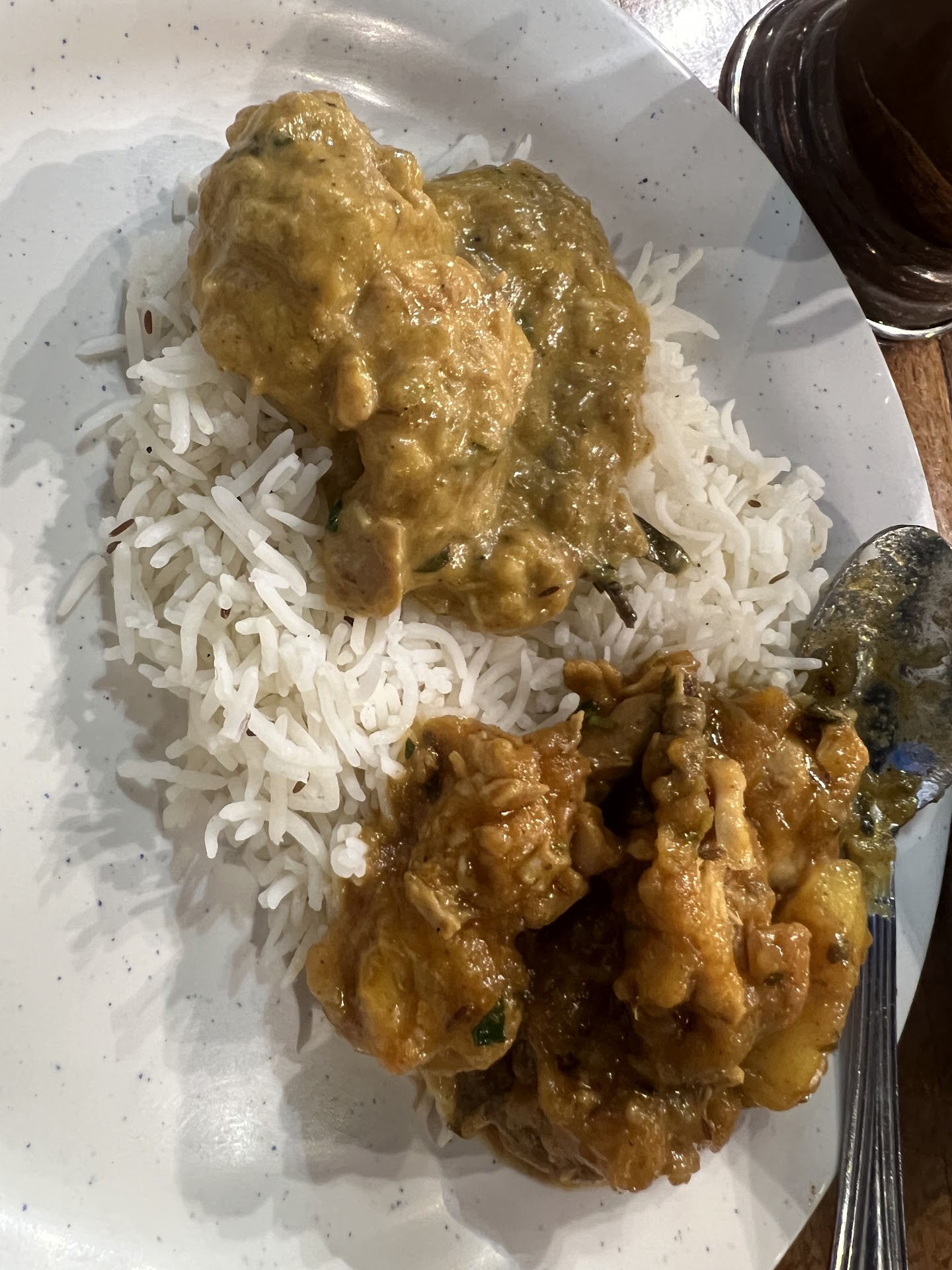 The waitress warned that the chicken korma had chicken bones in it, which was fine. The vindaloo also had bones in it, so it was odd she didnāt warn about that one as well. They both tasted amazing, but felt skimpy on chicken. The samosas were okay; much better with the green sauce (Iāve forgotten the exact name). Without the sauce there wasnāt much flavor to them.