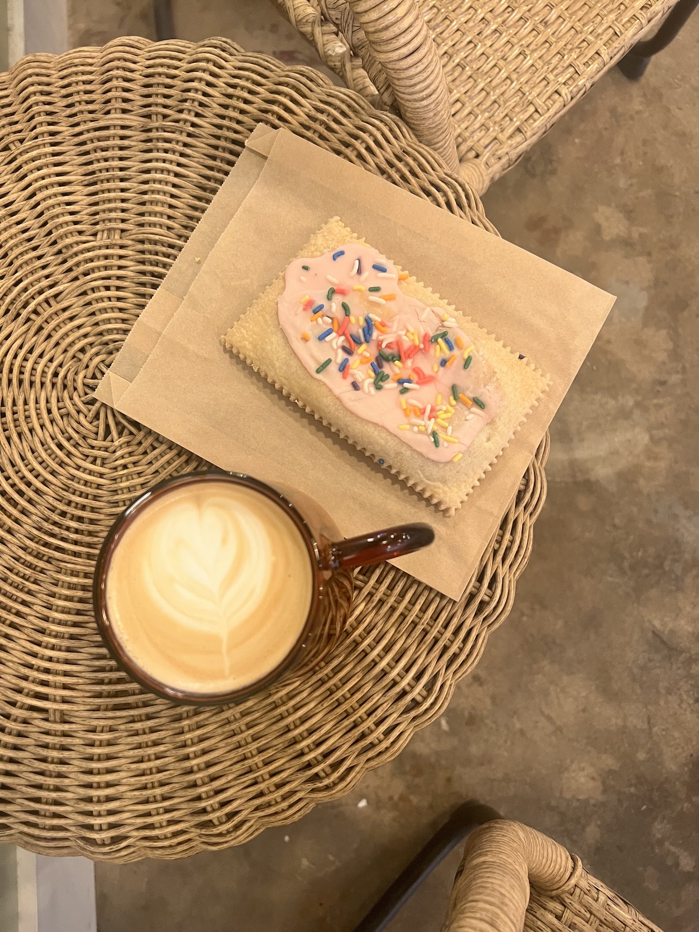 Today was my first time visiting this coffee shop. I usually go to one with a drive thru because I have a toddler but I'm glad this one was actually walking distance to my place. They have a small area for little kids with some books and tiny table there's a changing table in the bathroom. The coffee was absolutely delicious and I've had many pop tarts in my life and these were by far the most delicious pop tarts I have ever had in my entire life.