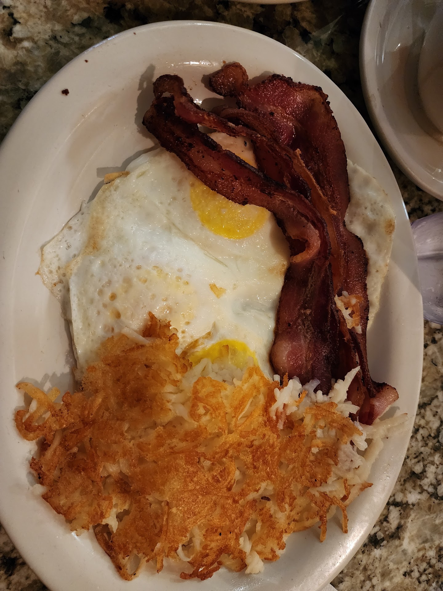 French toast combo -French toast: 5/5, it was very thick and nice eggs 3/5: very bland honestly, I mean I got over medium, so not expecting it to be salt and peppered before hand, and when I did add some salt and pepper it was goodish? Something about the eggs was very watery Bacon: 4/5, it was good! I think It wasn't pork bacon tho? It was cooked perfectly but not necessarily my taste preference for it -Hashbrowns: 1/5 , I really didn't like it honestly. The top layer had a very thin crunch but underneath that the potatoes just tasted like wet startch with the consistency of wet slop. No seasoning at all. And when I did add salt and pepper it didn't help much. Personally I love crunchy / cooked well hashbrowns. If you like hashbrowns more on the wet squishy side these would be great for you.