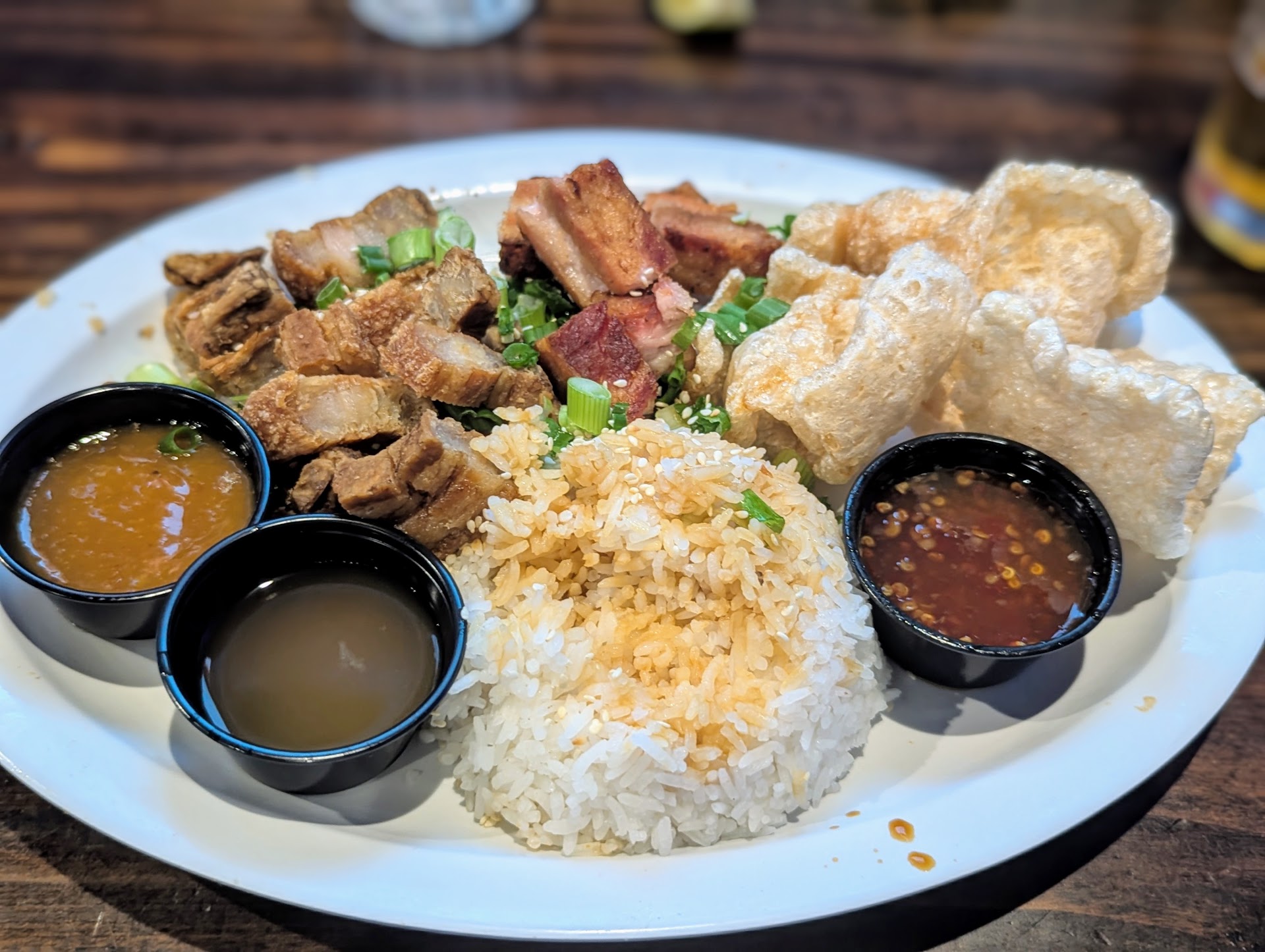 I ordered a bowl of green chili since this restaurant boasts a menu featuring both Filipino and New Mexican cuisine. However, I wouldn’t recommend the green chili to anybody. There were maybe two spoonfuls of the actual stew at the bottom which tasted more like garlic than fresh chiles… then piled with their carnitas which was stringy (indicating overcooked and dry) and potatoes that were cooked at too high a temp so the outside was over browned and tasted burned while the insides were undercooked and hard.