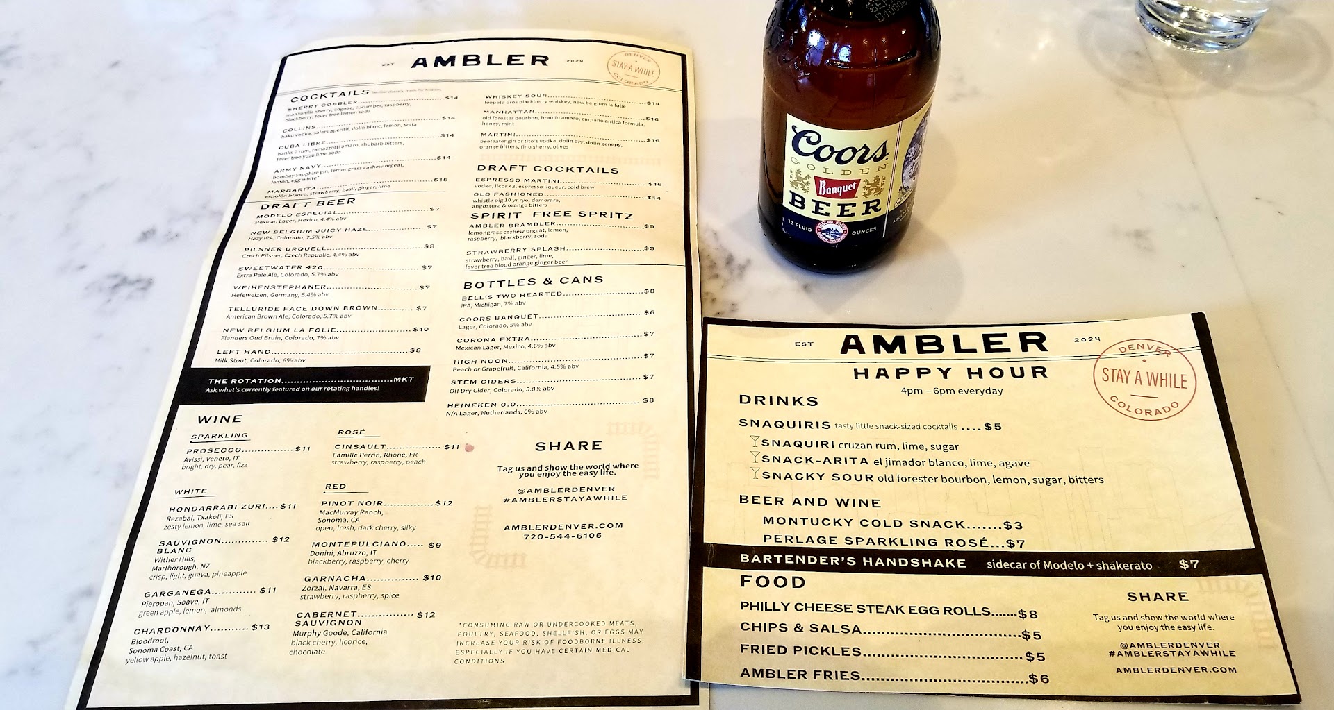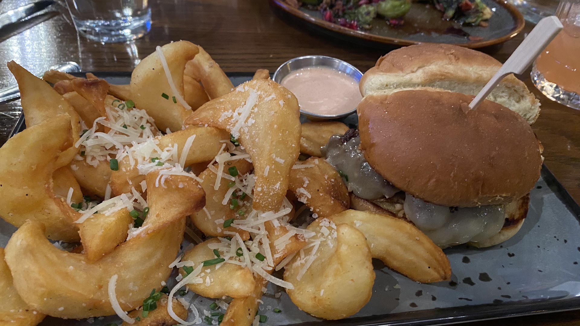 Given the choice of a proper table or bar seating, we chose the former . Margaritas were 100 % perfect—best I’ve had! Food: Brussel sprouts appetizer, main dish cauliflower, smash burgers and the signature Ambler fries. Our server recommended those house-special fries. He was right—-don’t miss them!!