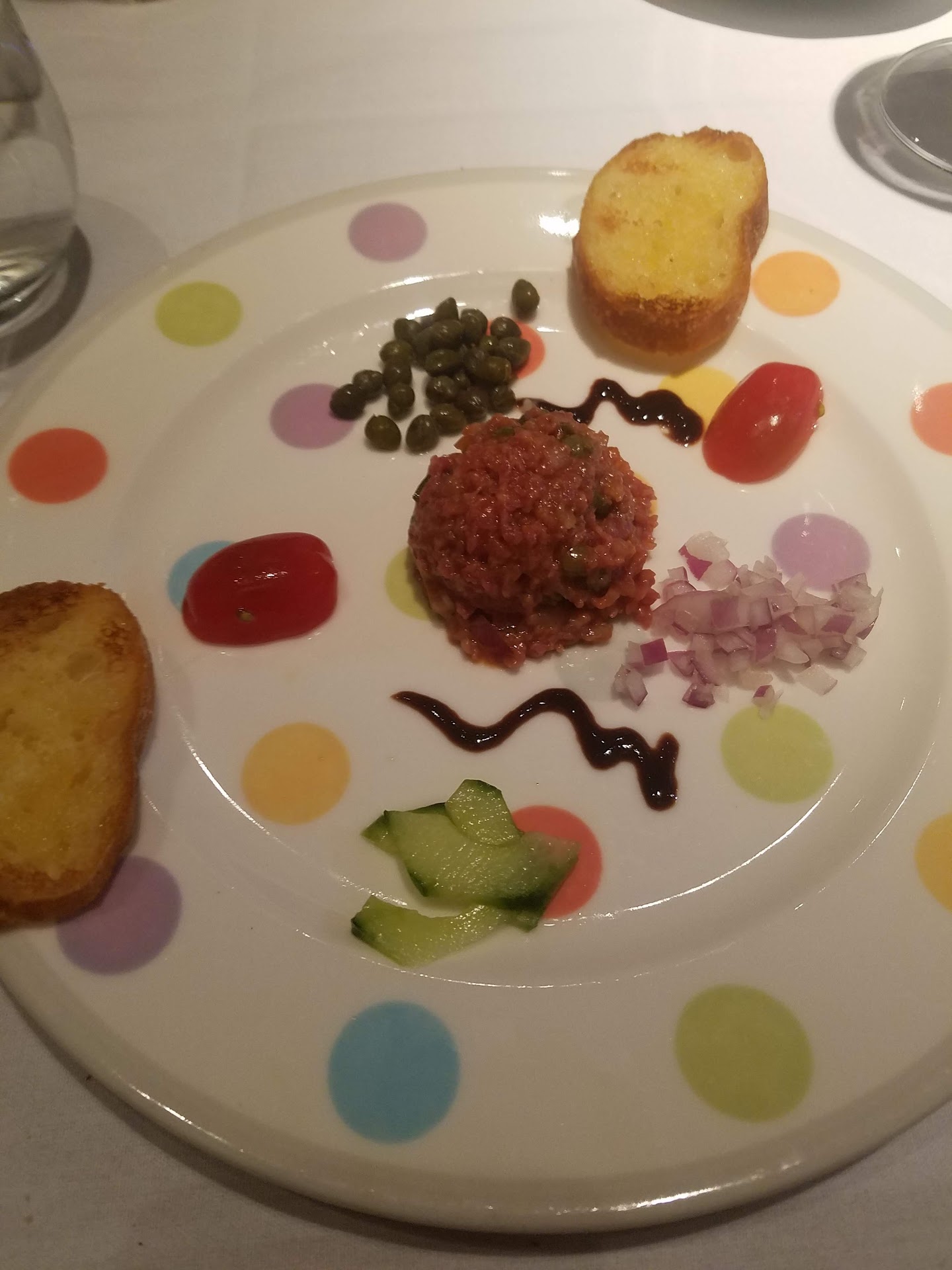 First off, my bison tartare was served on what looked like a child's platter, with the food arranged in such a way as to coax a small child into eating something they don't want to eat. Okay, that's weird, but not terrible. The curry oil wasn't a bad idea, but it wasn't great. Pickled onions and capers were a nice touch, though. My wine pairing? Bad. If there had been a potted plant nearby, it would be dead right now.