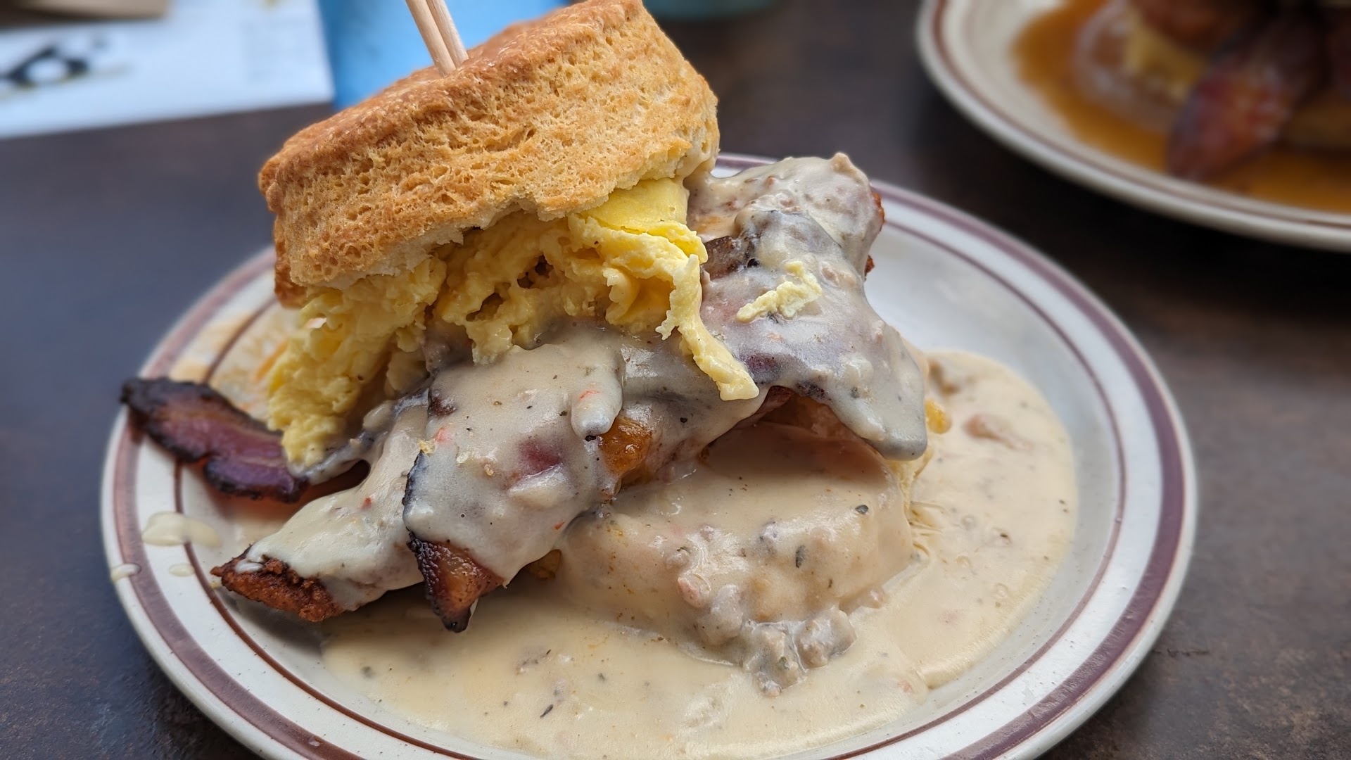 Read moreJust finished eating here for the first time. At first I had high hopes for this place but soon they disappeared. When I first got there the servers were polite. A waitress asked me if it was my first time there and I told her yes. She said she would get me some water and help myself to the open coffee bar. I was there around 1 pm. I went and got some coffee but it was warm slash on the cold side. I didn’t know that the coffee was charged from the waitress not stating that. I ended up paying $5 from drinking two thirds of a cup of cold coffee pretty much. I ordered The Franklin and a slice of pizza to test both sides of the food experience out. The pizza came out first again not really hot but warm. 10 minutes later the biscuit sandwich came out which was delicious but again on the warm side. I ended up eating my pizza and a few bites of the sandwich before I decided to take the rest home. At this point the menu was already picked up by the waitress. I asked her if I could get some extra gravy and she said “of course”. Again didn’t tell me it was an extra charge. I figured my bill would be about $25. She brought out the check and it was $35 basically. $10 more than I expected. I told the waitress that I didn’t know the coffee was a charge and she said “oh” and walked away lol. Overall I think the food was ok/decent. For having a $35 bill I would expect the food to be more hot and the coffee. And also this waitress should be a little more trained on explaining pricing to her guests. Ps at the end after she charged my card she had my receipt and card in one hand walking all around the restaurant picking up plates and stuff then dropping off my card and check. I didn’t like that very...
