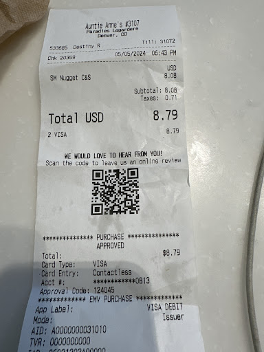 Read moreWe came to the Auntie Anne’s in the C concourse at Denver international airport for some food on a layover. We left members of our party with our bags at the gate and went to look at the menu and when the woman who was working came over we said we were looking at the menu. So she turned around and went back to working, then came back to us while we were still trying to decide and was visibly frustrated and annoyed that we were not yet ready to order. There was no one in line. She didn’t get our order right and when I asked again, she threw the cups of pretzels into the bags. We explained we were trying to get the order from our kids at the gate and she responded rudely. We also asked for Regulars and she told us she only had smalls. Must’ve been a rough day in the...