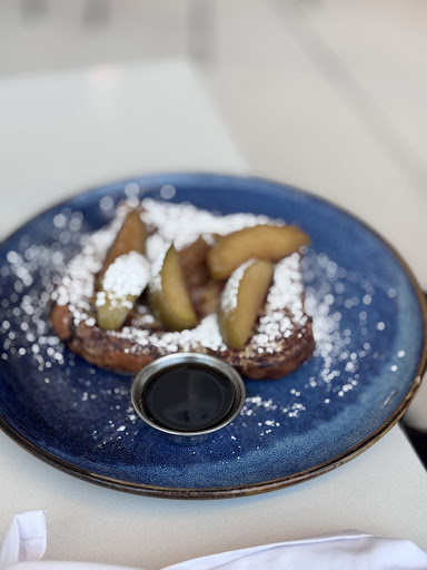 Let’s talk food: 🥖 The French toast came out looking like it got a glow-up — fluffy, sweet, topped with caramelized apples and snowed in with powdered sugar ❄️🍏. That syrup? Dark, mysterious, and dangerously pourable.