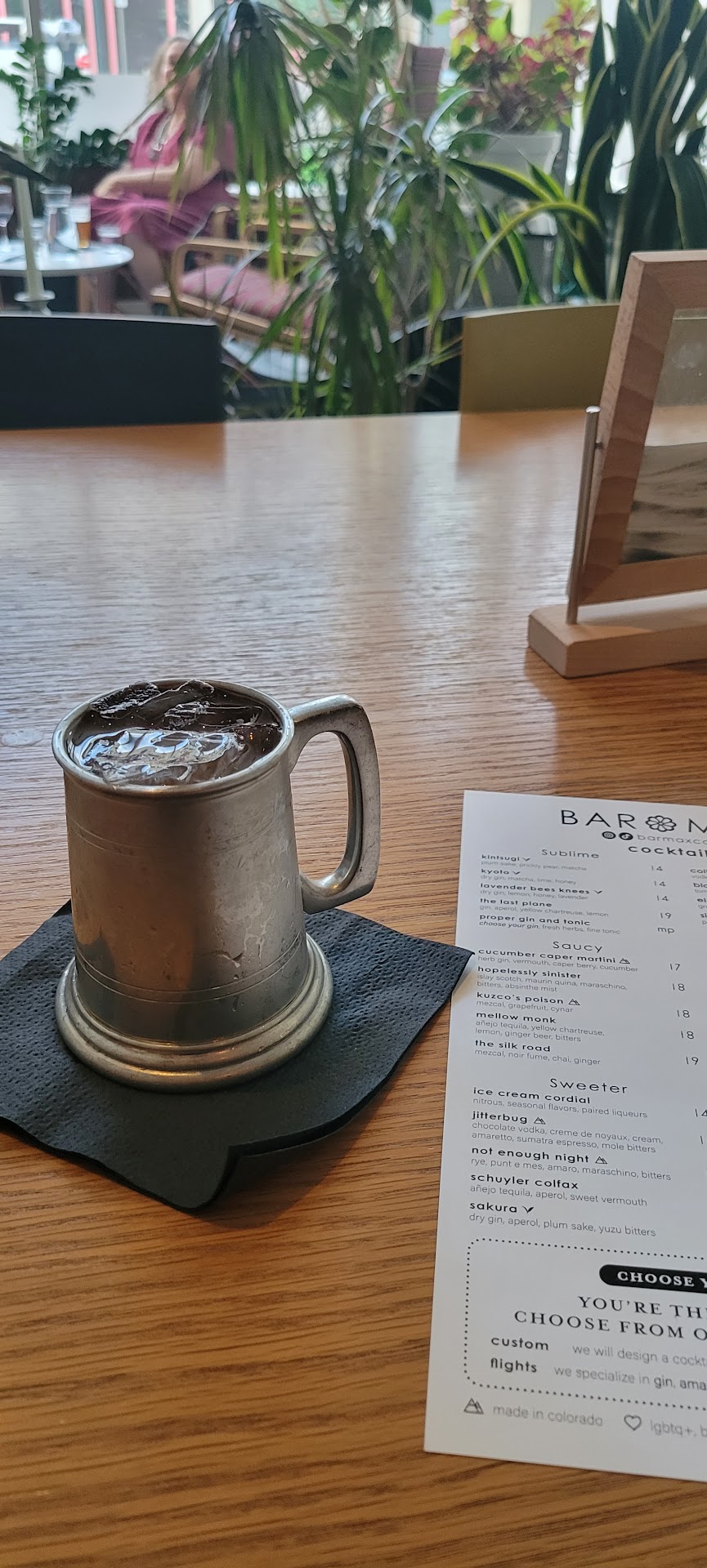Read moreI guess this is a bar or is it an escape into an abyss of chill vibes...Eclectic seating and design helps make you forget what's outside the doors you came in from. Staff are so diligent and observant it's as if they my long lost friend trying to reconnect our old fun bonds. Biggest array of possible cocktails in one location and they, yes they are also as delicious as they look. We both got two tequila creations one made up by the bartender and another on the menu. "The mellow monk" is a delicious upgrade of the classic Mexican mule. Light on the ginger beer and heavy on the flavor. Definitely a must try. If you're looking for a spicy tequila cocktail with a tasteful burn and exotic presentation show them the picture below because I never got a name for it. Didn't come for the food but others seemed to enjoy. In summary, this is that modern "70s show" basement hangout (minus the smoke), add the happy feels and available playful games and tunes to make this the place to come kick it with old and new friends! Moms and...