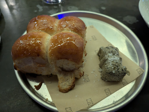 We added an order of bread, which came with a charred leek butter pressed into a bear shape. Don't let the color distract you, it's a brilliant dish. The four fluffy yeast rolls with a light sheen of oil or butter were great alone, but oh so savory and delicious paired with the grey smokey leek butter. I will order this again on all subsequent visits.