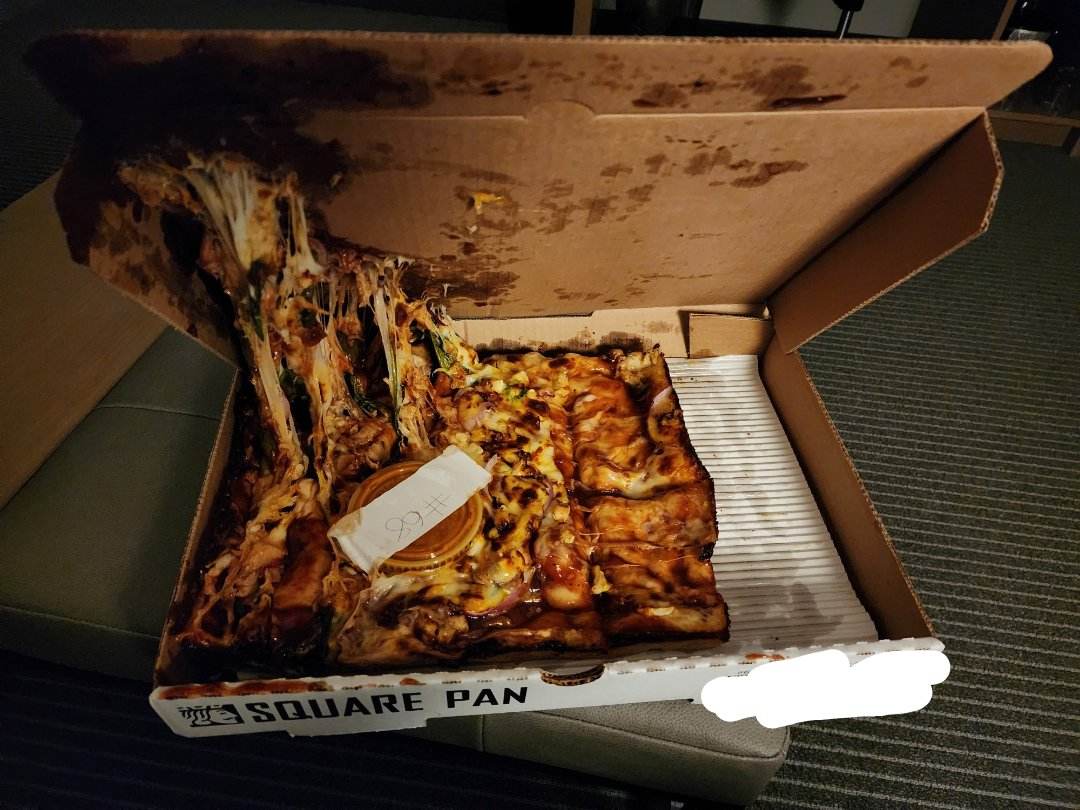 Now it's finally time to eat, and we find a droopy raw dough pizza underneath some melted cheese. This wasn't us being picky. The pizza was straight up uncooked and wasn't safe to eat.