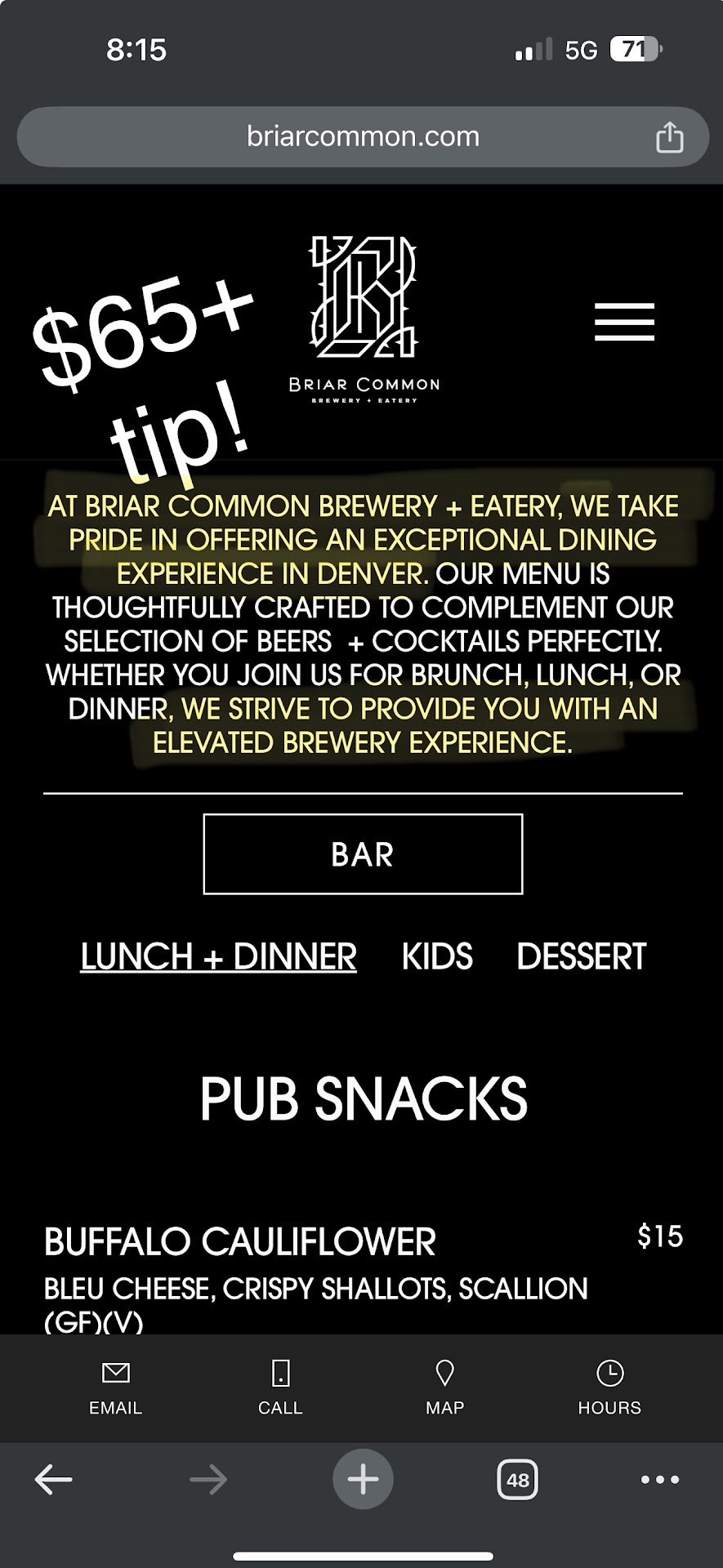 I bought Nuggets tickets for my boyfriendâs birthday, so I searched Google for the best places to eat near Ball Arena and kept coming back to Briar Common Brewery. Reviews were excellent except for a few, but I really loved the responses I read to all the reviews. It felt authentic and like the place to choose. The atmosphere & food looked amazing in the photos, and overall I was very excited to try somewhere new and eat here. I made a reservation for 5pm last night through their online reservation system. Today, on our way, I had to adjust our reservation once I realized our drive from Fort Collins was going to take longer and push us later to 5:30. I made the change through their system at 3:45 fearing the 5pm reservation would be hard to meet driving down I25.